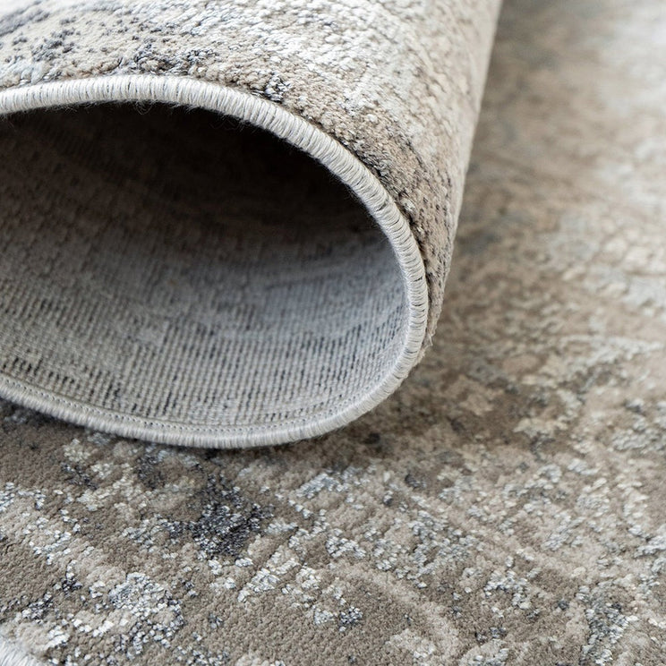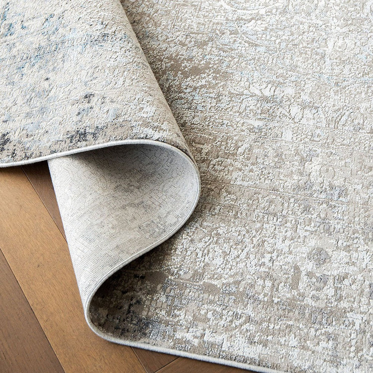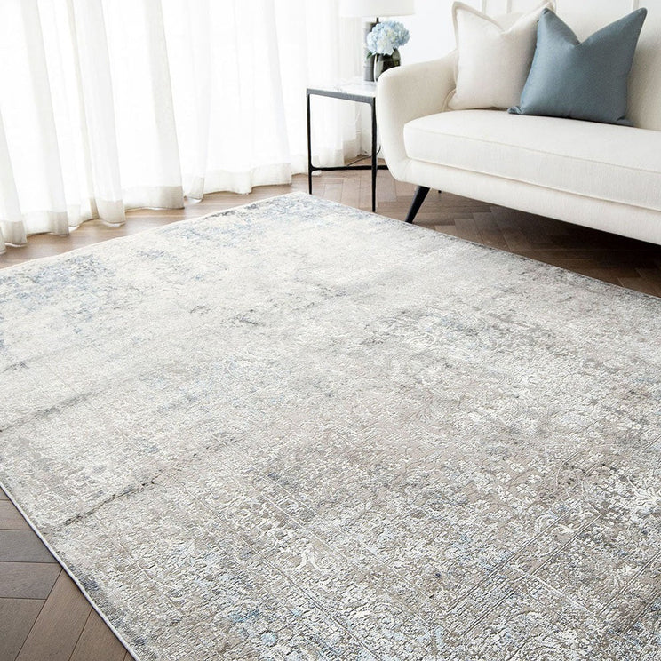 In light grey with a traditional pattern, this luxury carpet has been deliberately faded for a beautiful vintage effect.