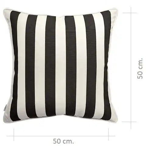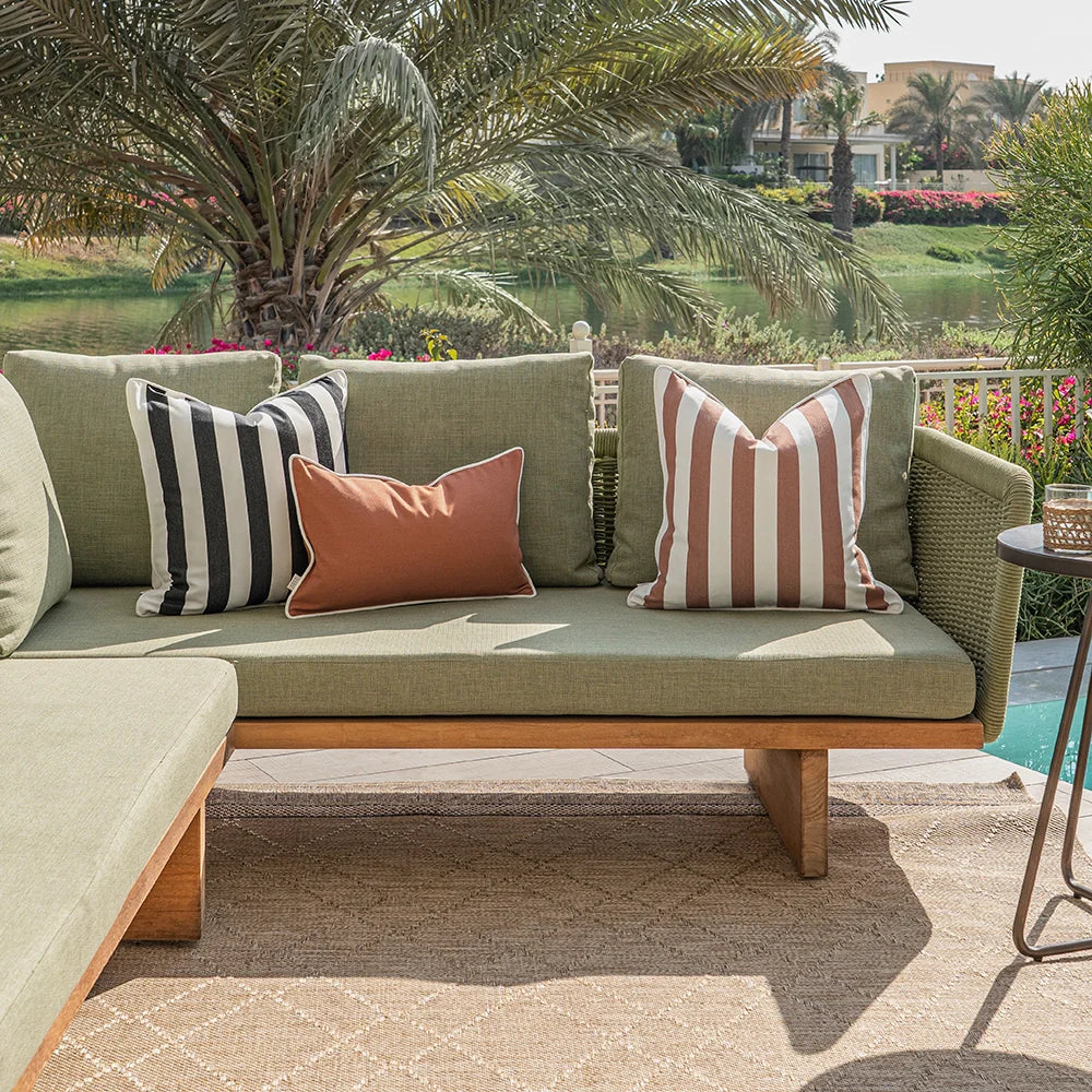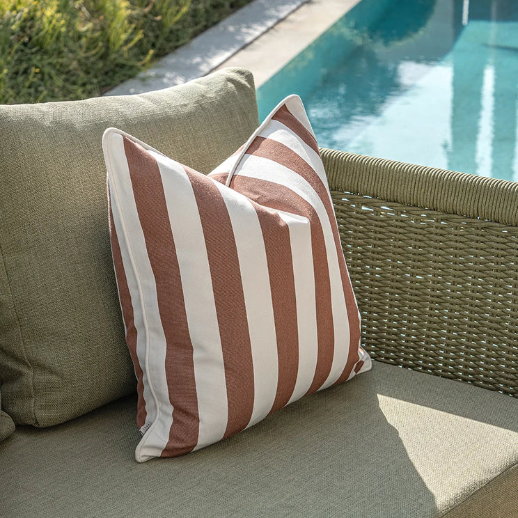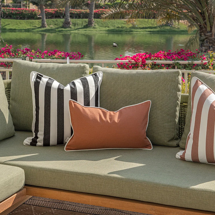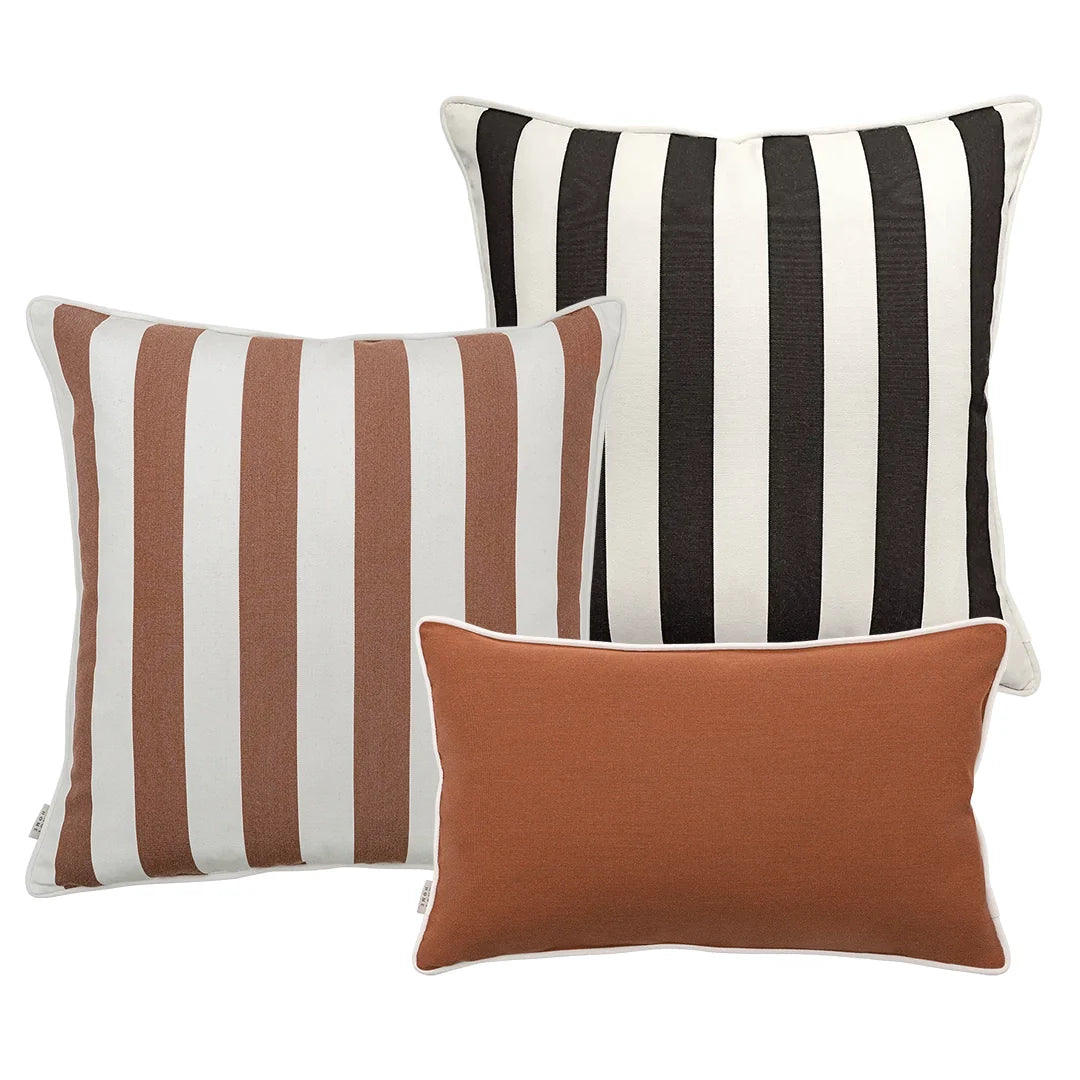 Define your outdoor style with this three-piece cushion set. Mixing plain and striped cushions in a punchy palette of ivory, black and rust, this designer bundle is perfect for modern minimalists.