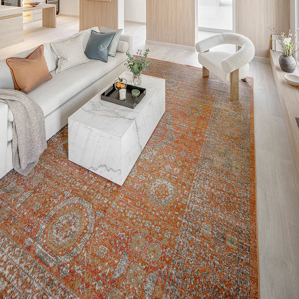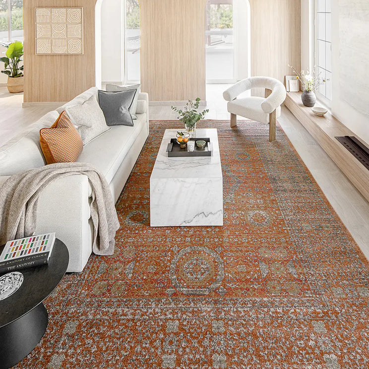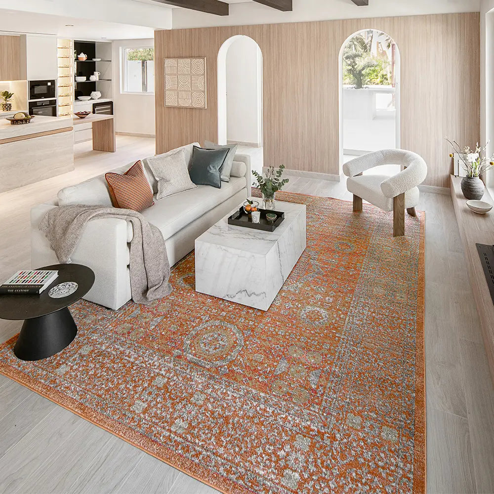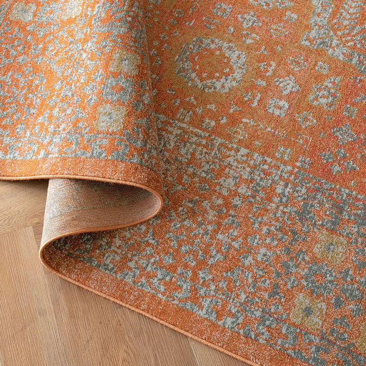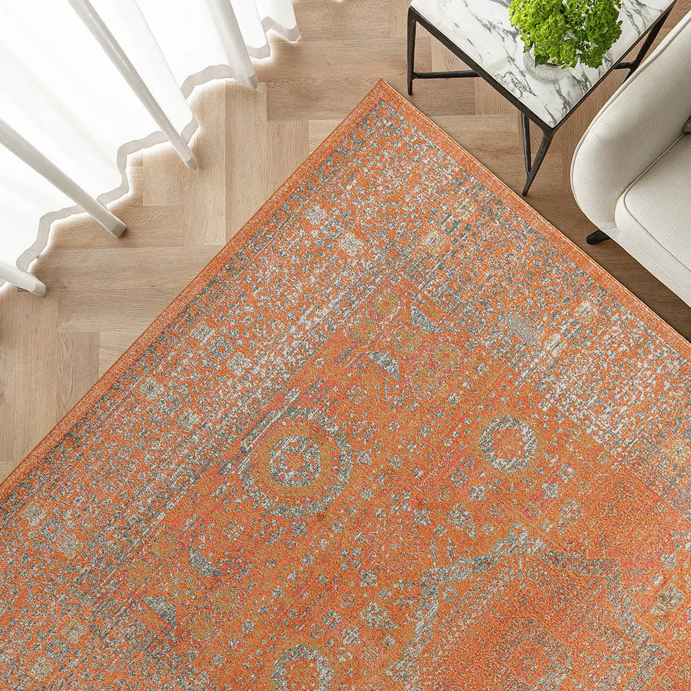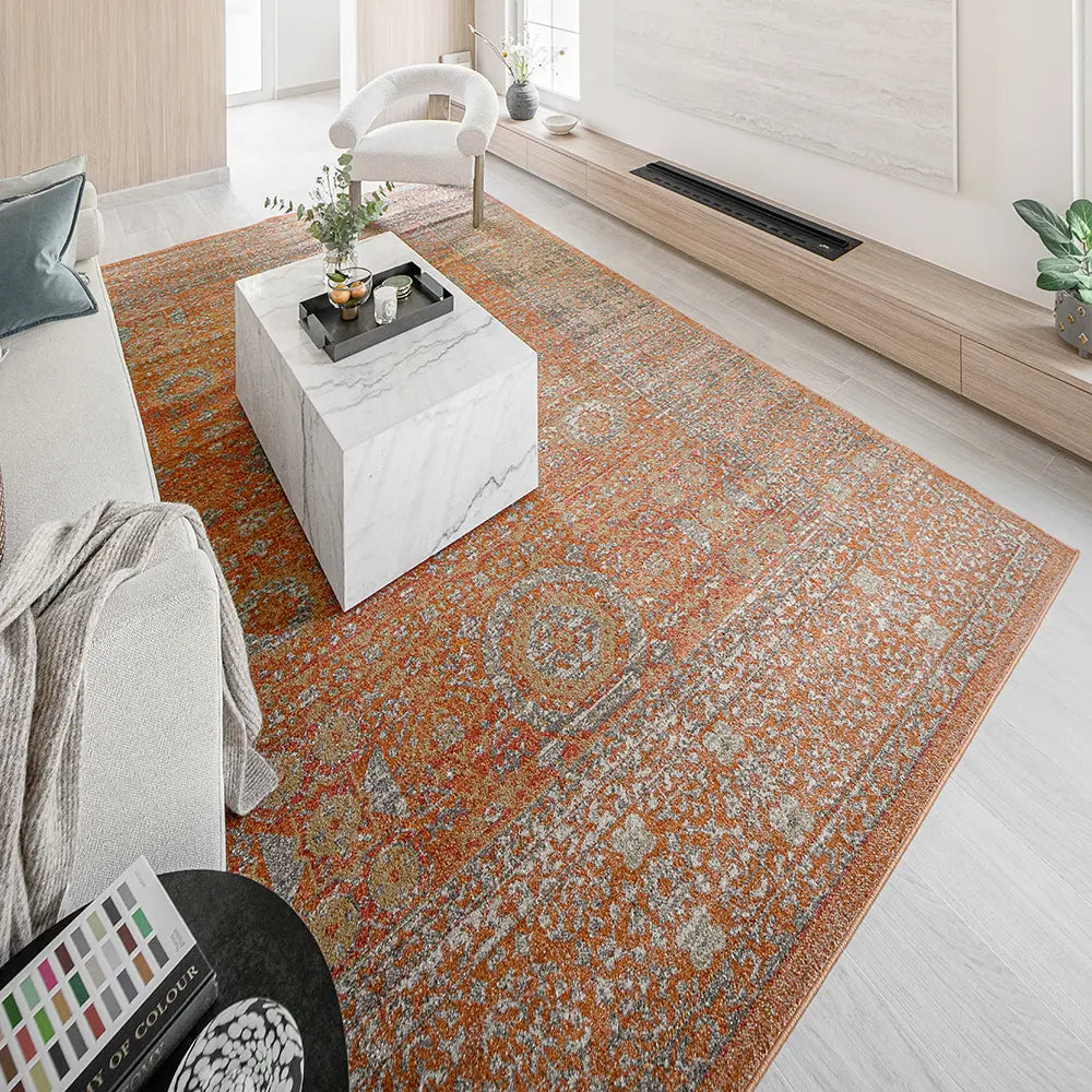 Here's how to warm up your living space with a dash of vintage elegance. This golden orange carpet has a faded traditional design for an antique feel but will be equally at home in a modern interior.