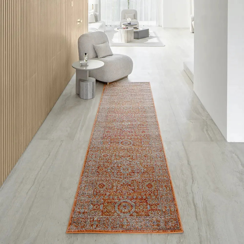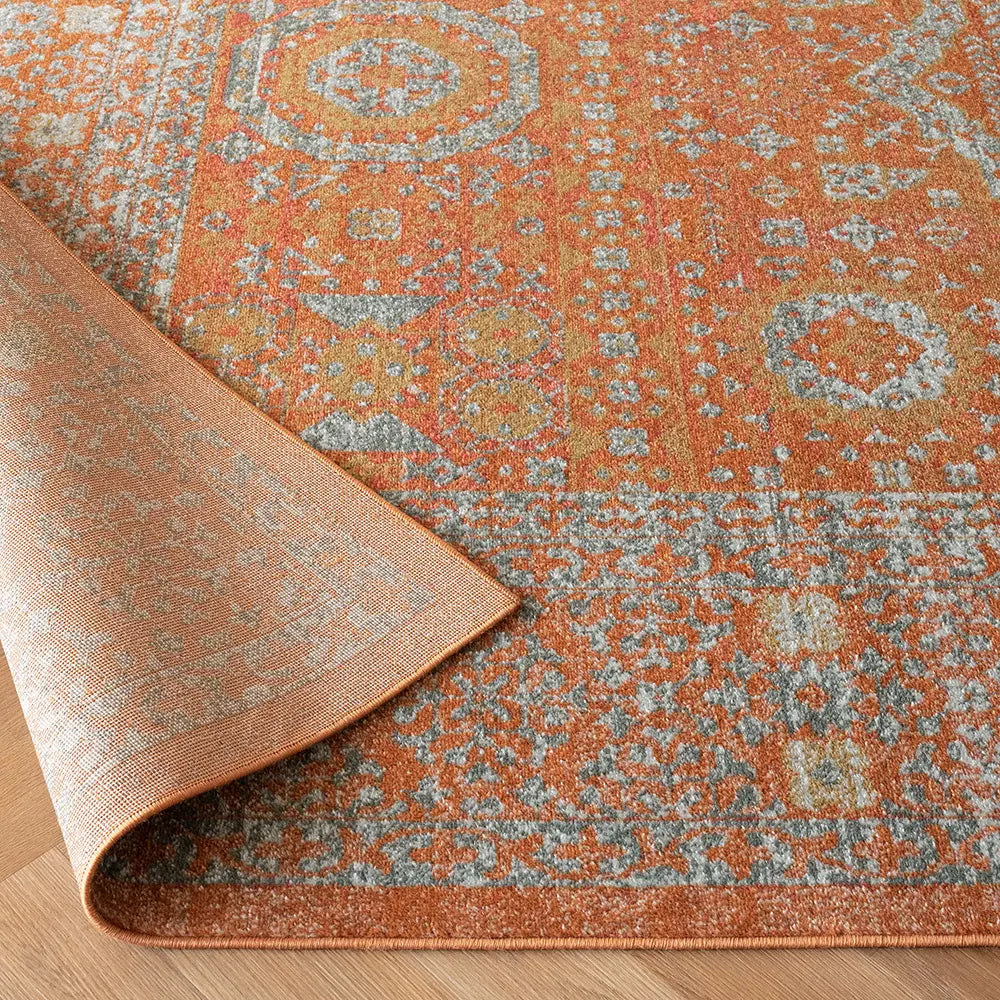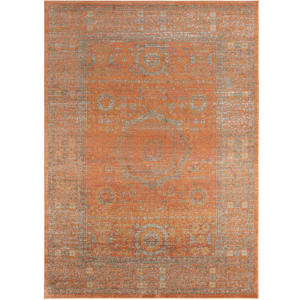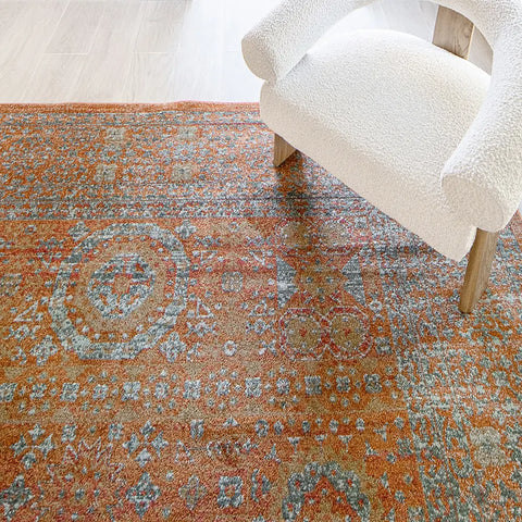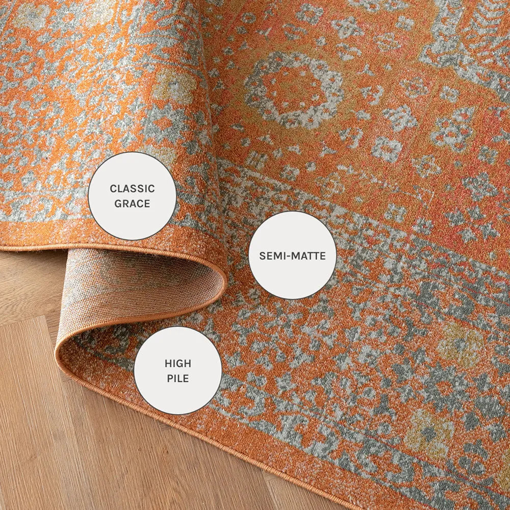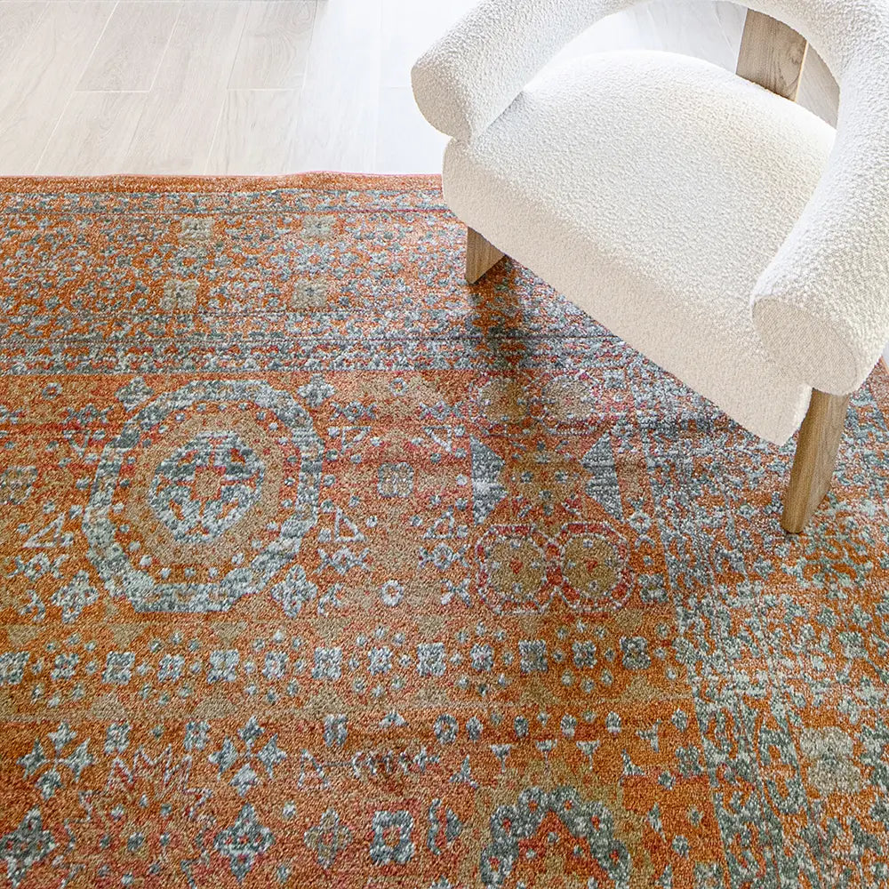 Here's how to warm up your living space with a dash of vintage elegance. This golden orange carpet has a faded traditional design for an antique feel but will be equally at home in a modern interior.