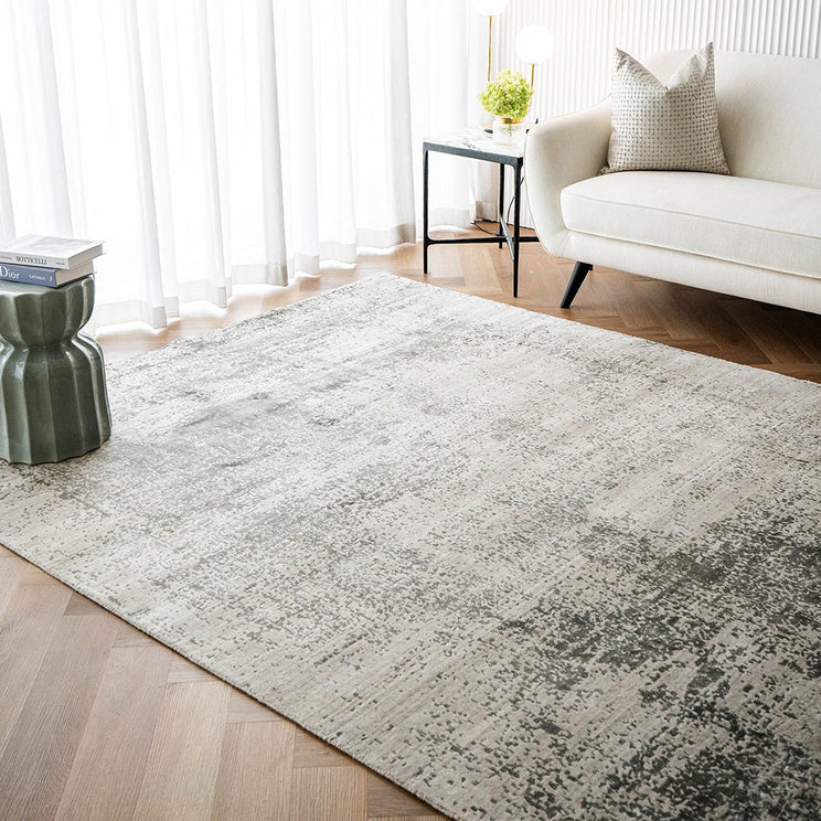 This abstract rug updates classic carpet design with an abstract pattern and modern materials.