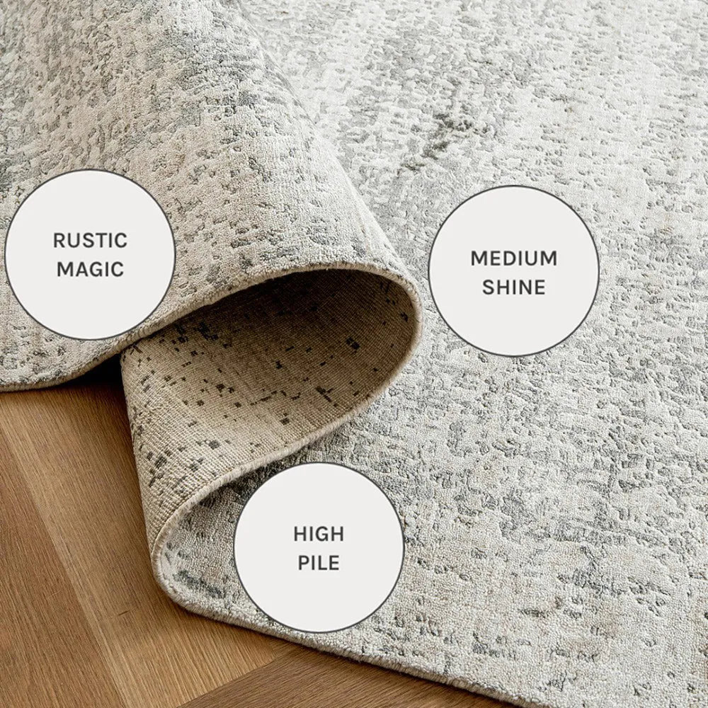 This rug is made from a tactile blend of art silk, combed wool, and cotton with a dense, high pile for softness.