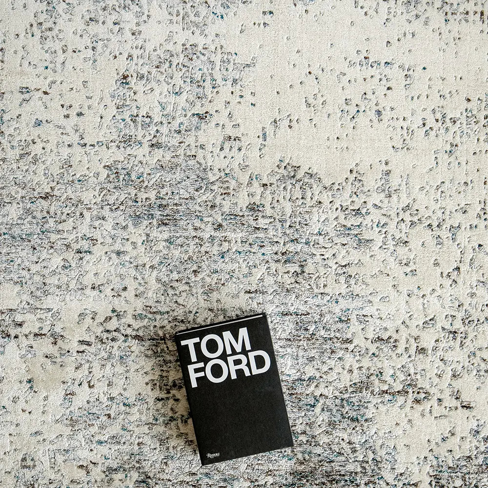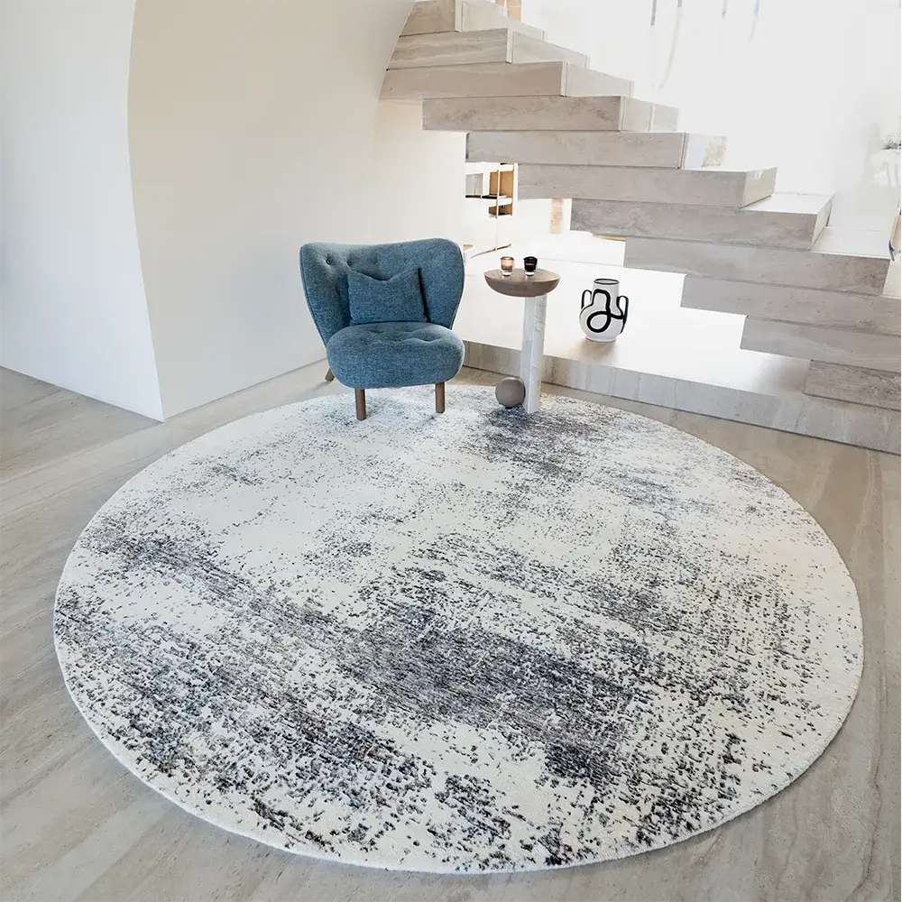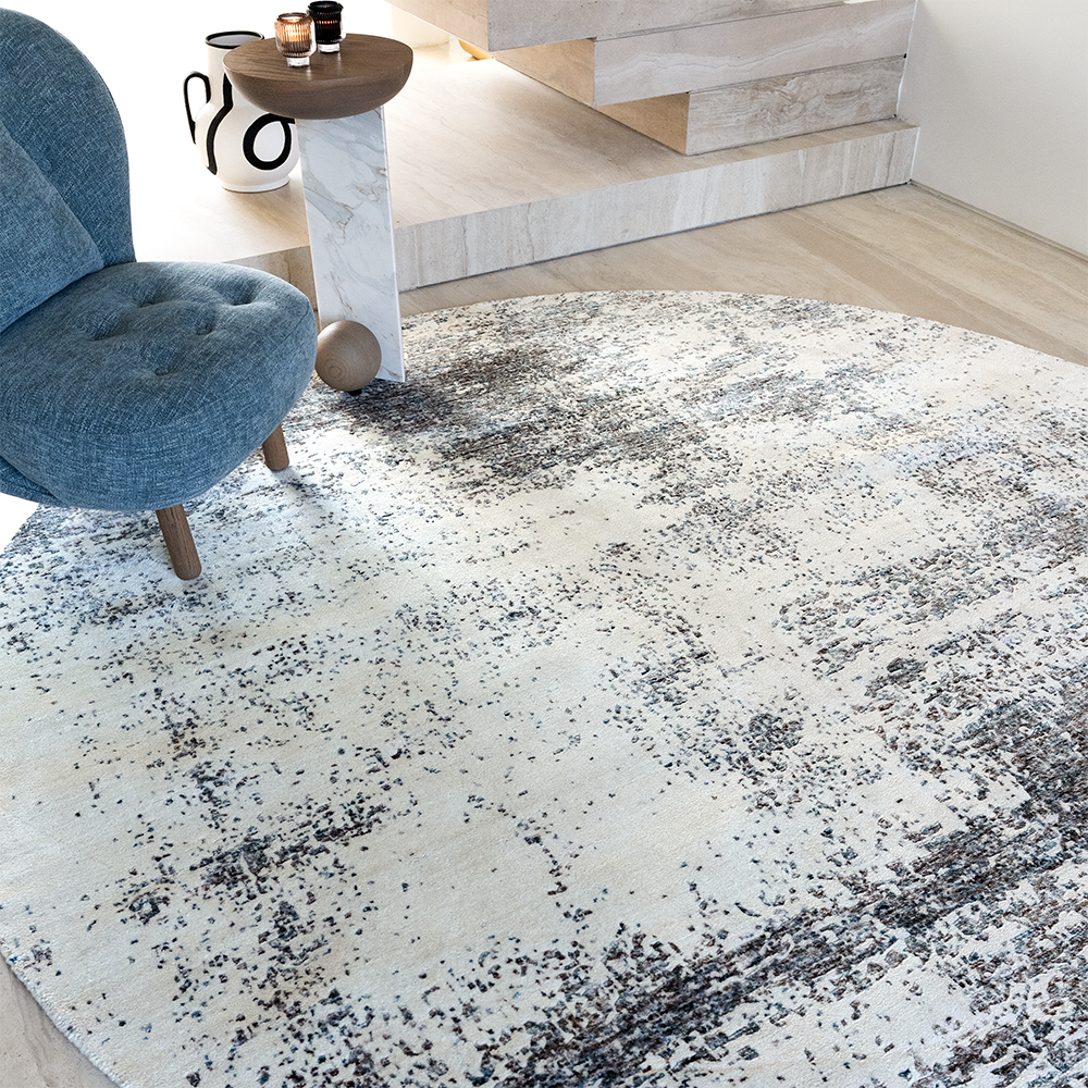 This abstract rug updates classic carpet design with an abstract pattern and modern materials.