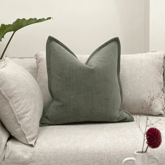 A textured cushion in an earthy olive-gray tone, woven entirely from natural cotton. Its soft ribbed surface and muted depth add a calm, grounding elegance to any interior.