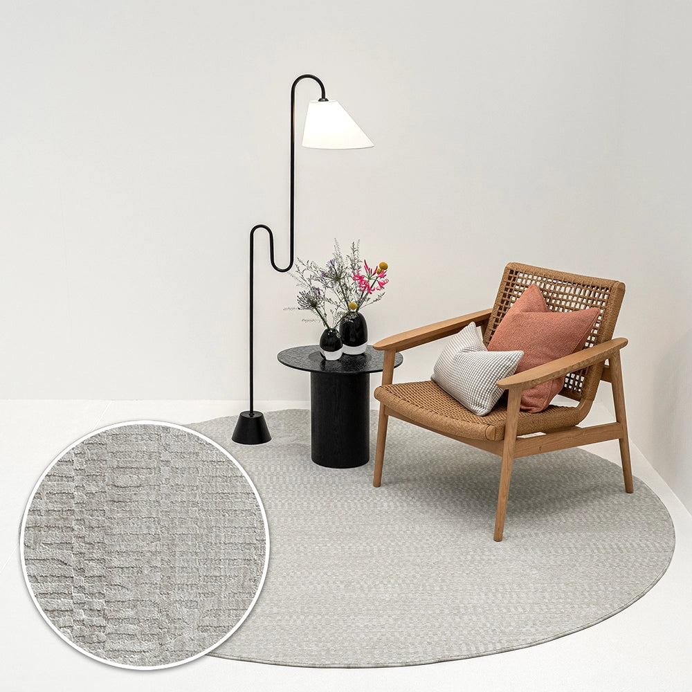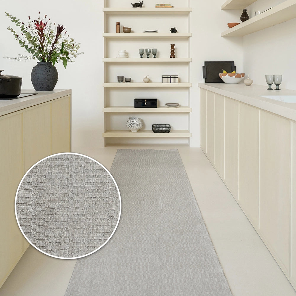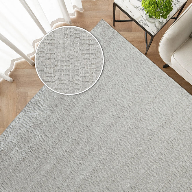 This contemporary carpet has a textured pattern of small rectangles and large-scale criss-crossing lines all over. Soft to the touch, the beige carpet is a luxury choice for a neutral interior.