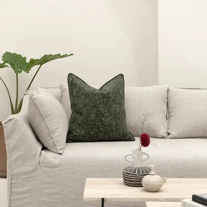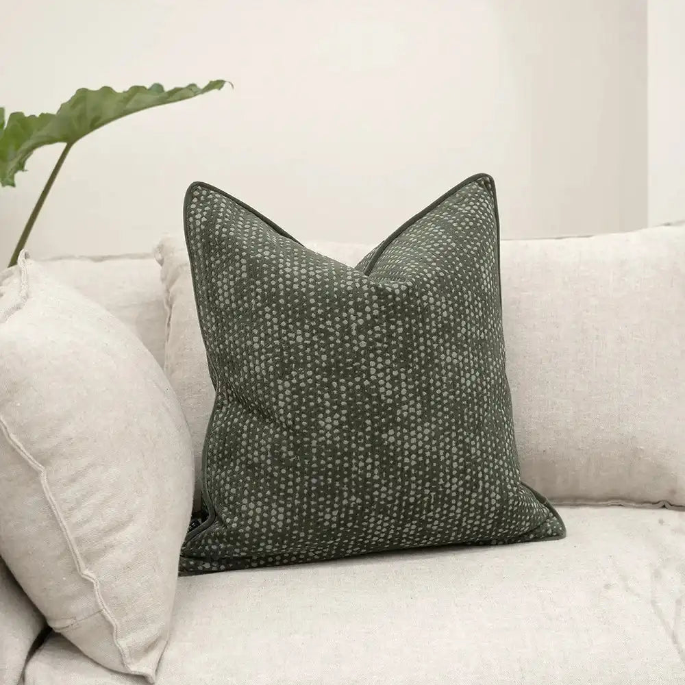 Irregular dots create a lively pattern on this sage green cushion. Finished with velvet piping all the way around, this cotton cushion is a cute and quirky update for your sofa.
