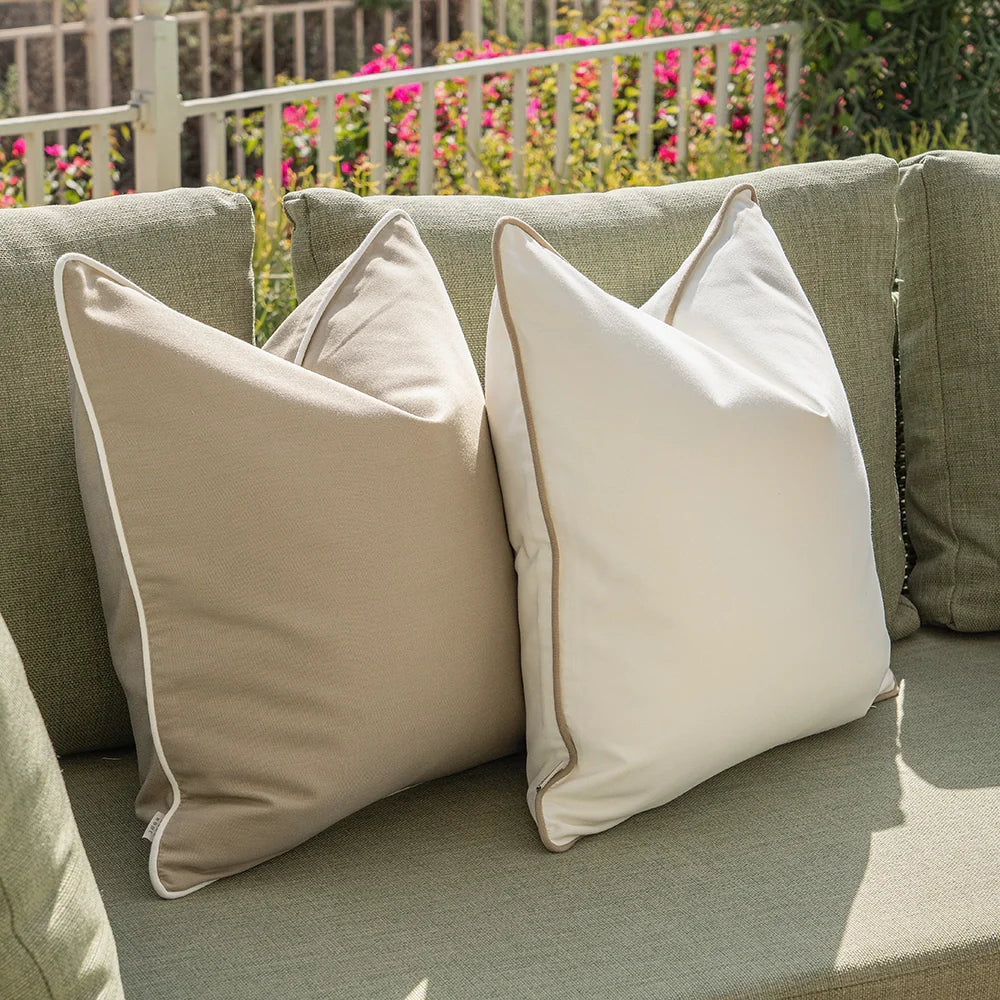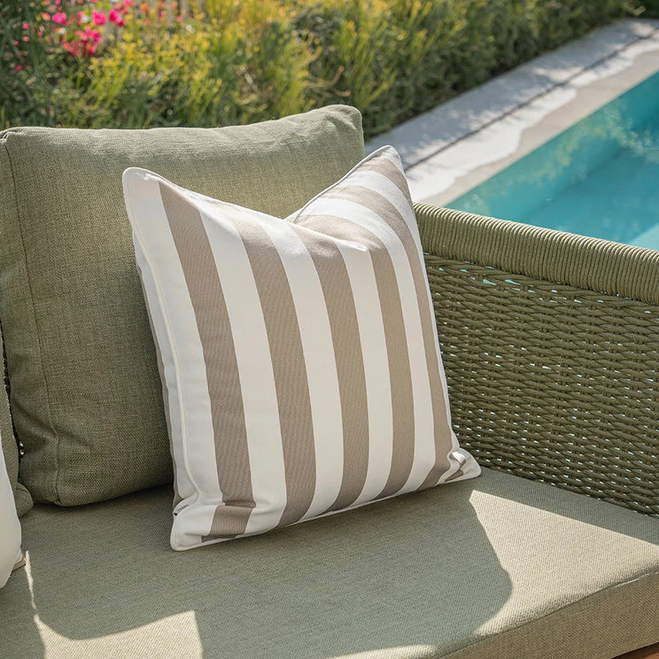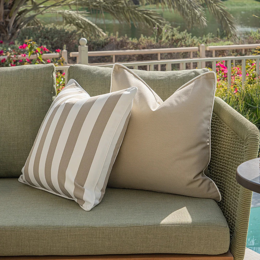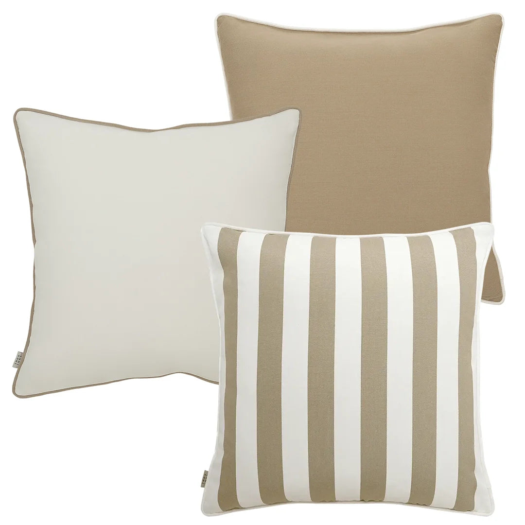 In neutral shades of ivory, mocha and beige, this outdoor cushion set will blend seamlessly with your patio furniture. This stylish trio includes a bold striped design for a contemporary touch.