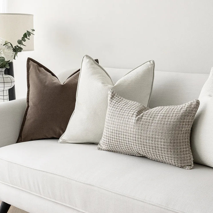 Looking to upgrade a neutral sofa? Turn to this brown and white cushion bundle in a mix of textures. Finished with a dogtooth check accent cushion in coffee brown, it's a stylish option for any living space.