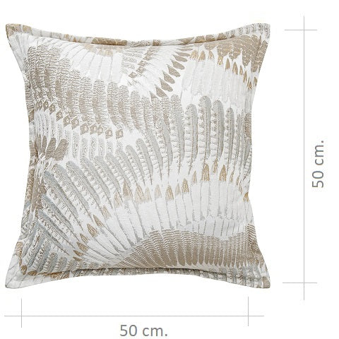 Design: Two orange velvet cushions and two white cushions with gold and silver feather pattern and a white back
