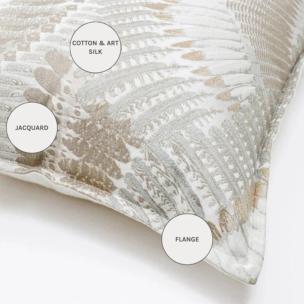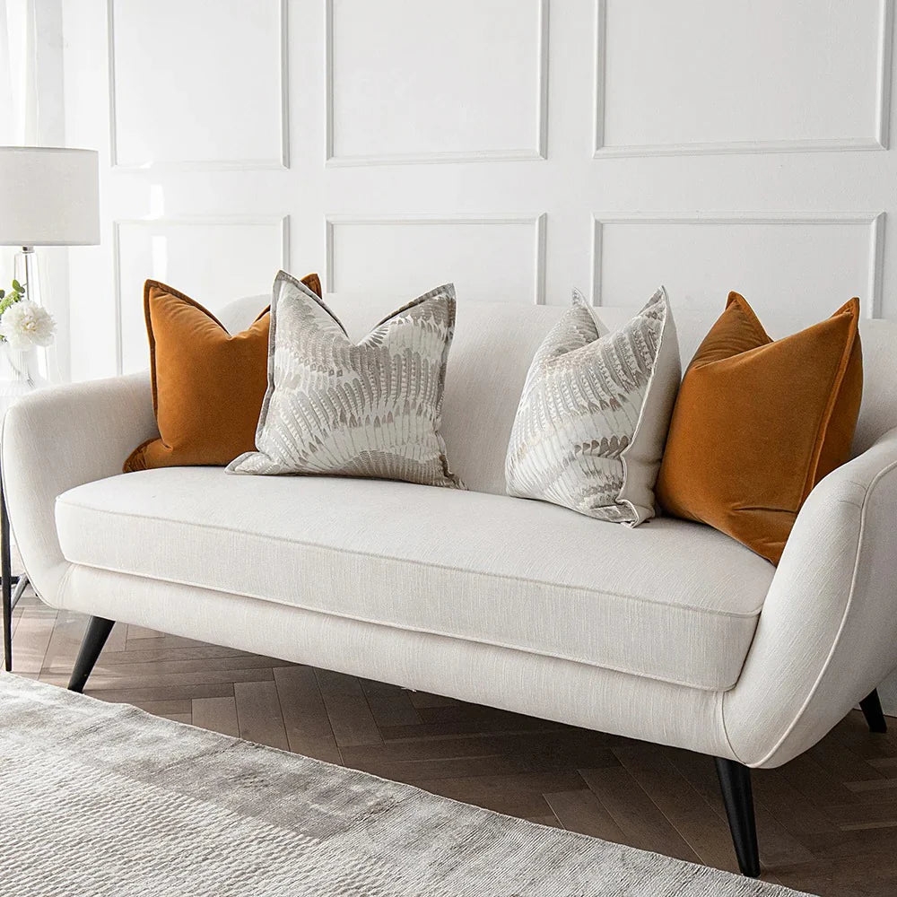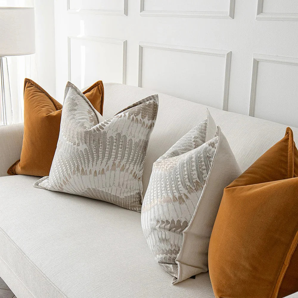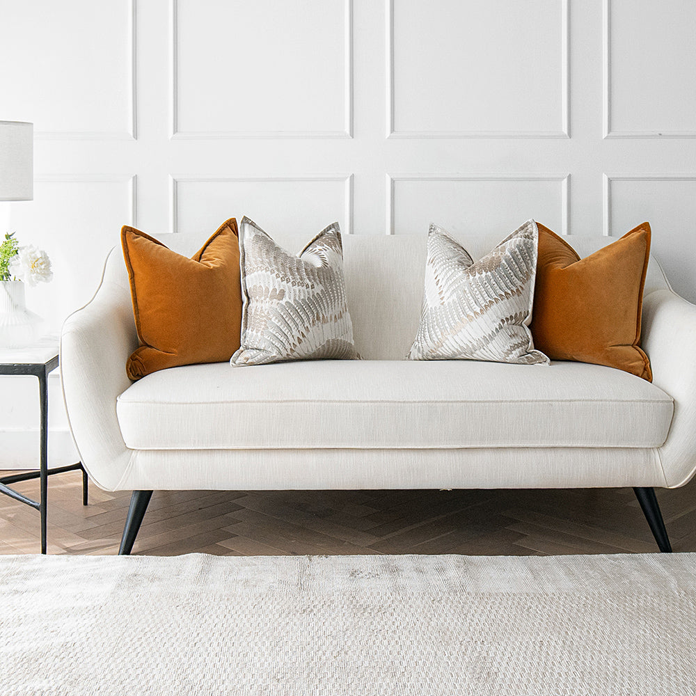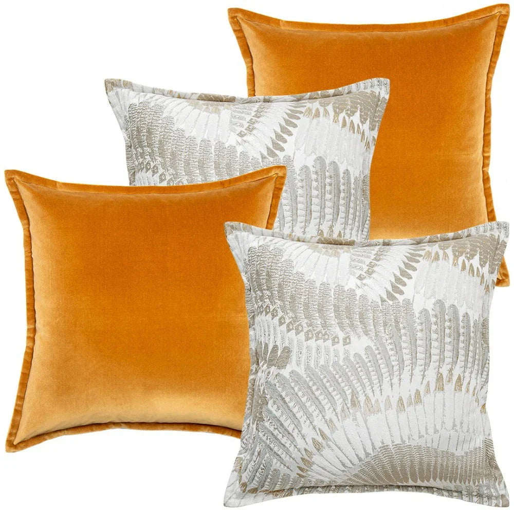 Our Emilia bundle is a real treat for your home. The four-piece set includes two plush cotton velvet cushions in a rich shade of orange, paired with two feather-patterned cushions in gold and silver.