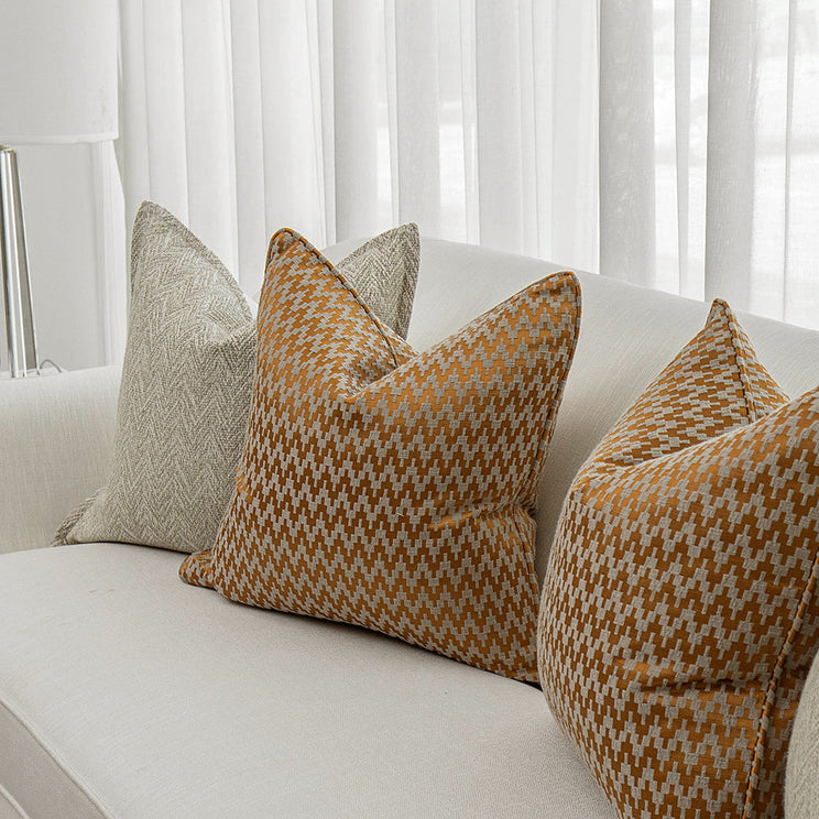 Zigzag patterns dance across all four cushions in our Janna bundle. It includes two orange and silver-grey art silk cushions with a semi-shiny finish, paired with two textured light brown cushions.