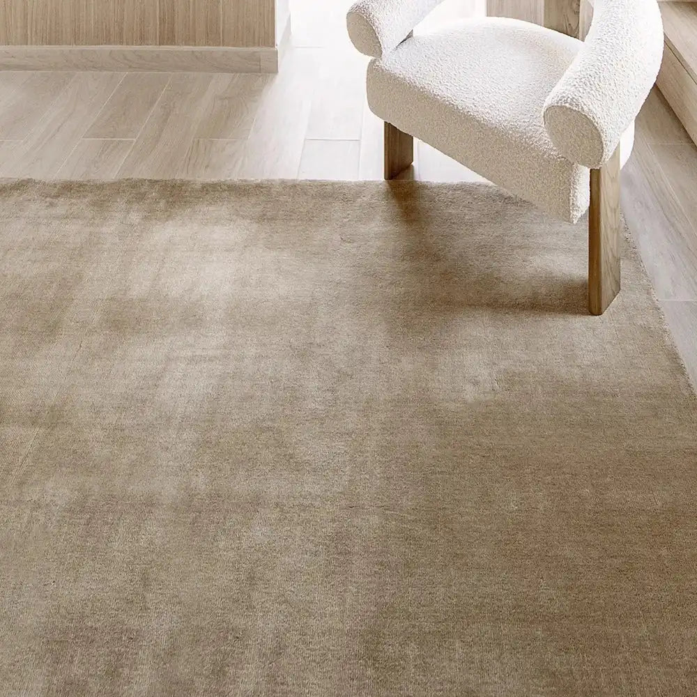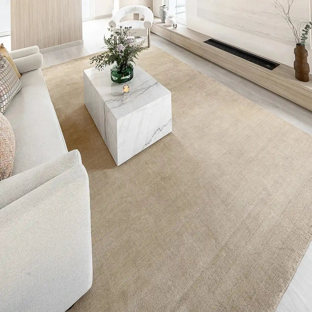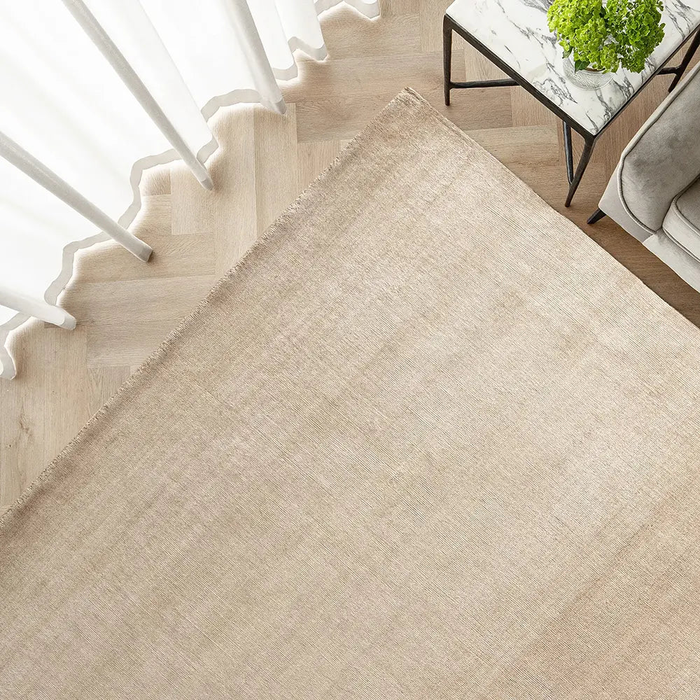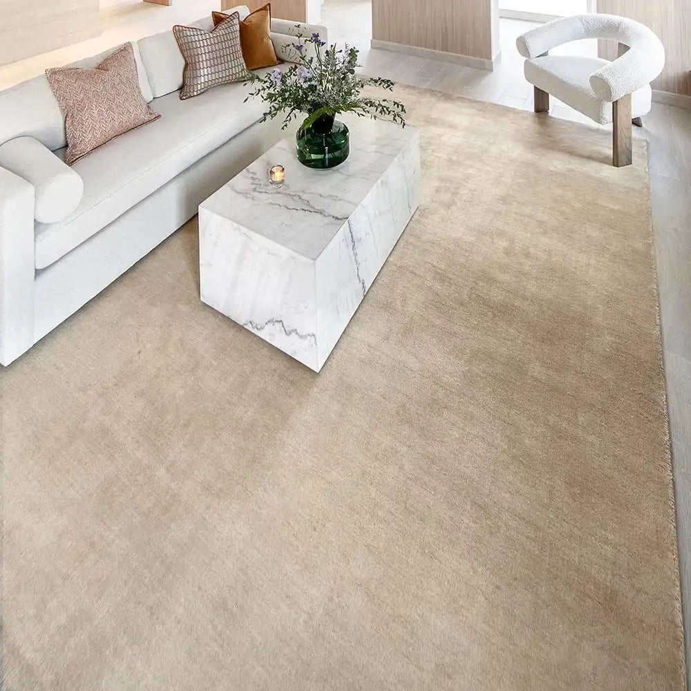 In shades of beige, this premium art silk and wool rug has a soft ombré effect to add richness to your living space.