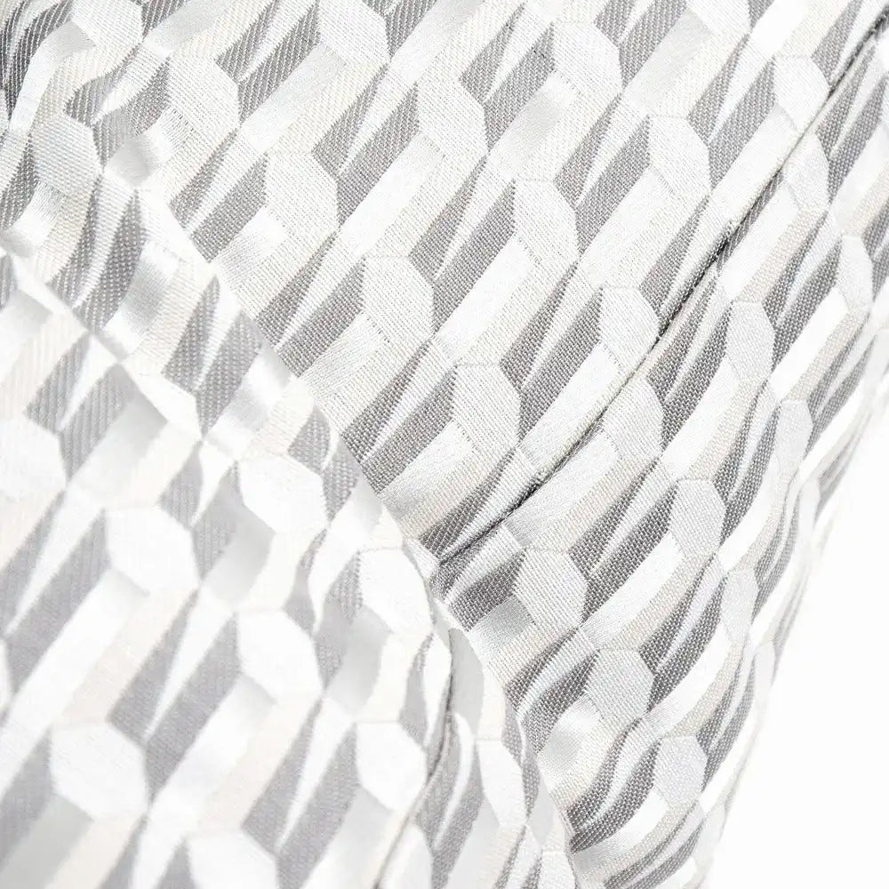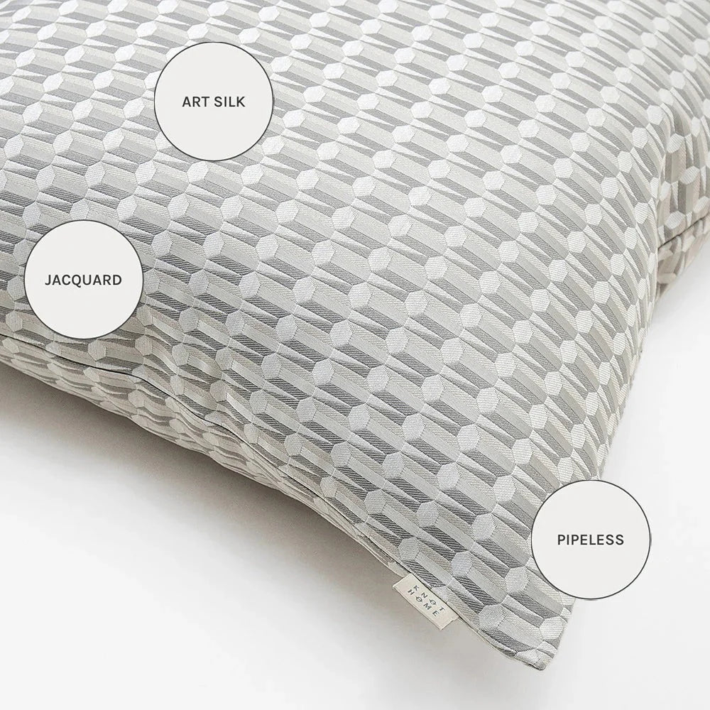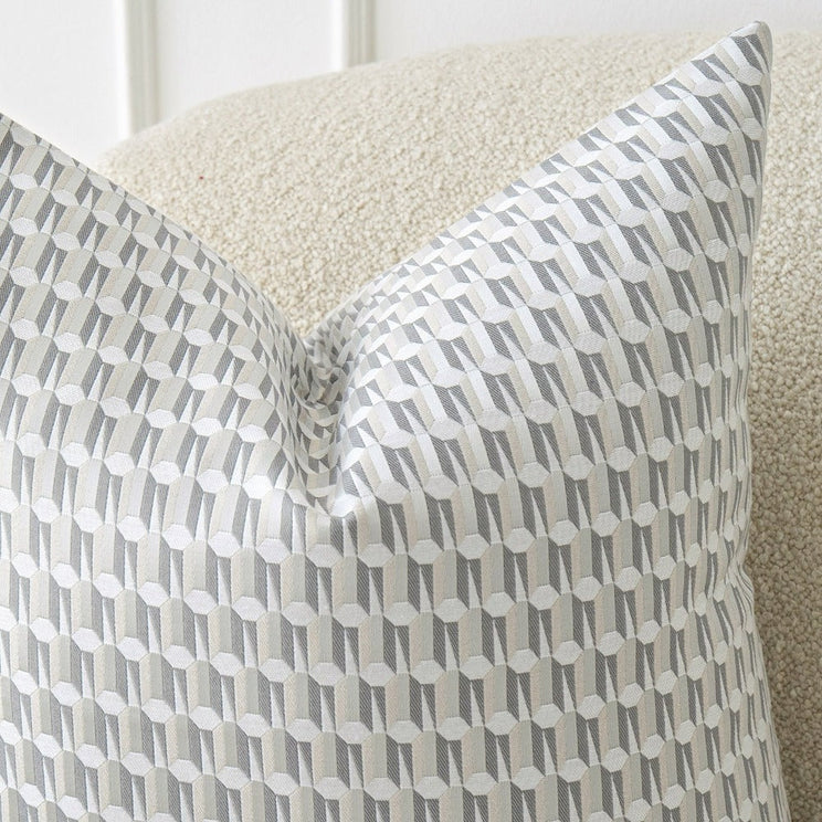 This grey cushion is a modern classic with its 3D pattern with light accents of blue. Woven in art silk, the decorative cushion has a shiny finish to add a designer gloss to your living space.