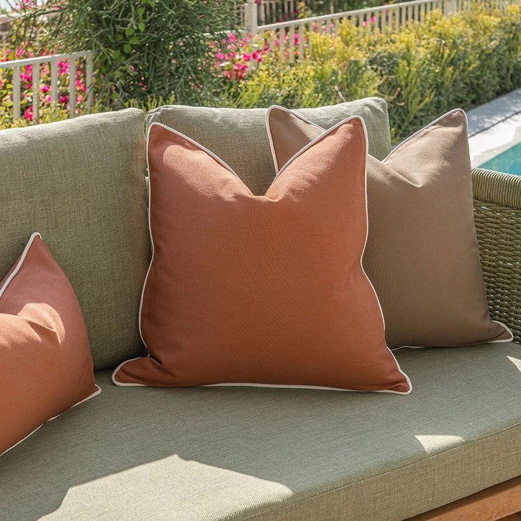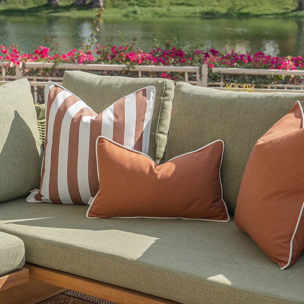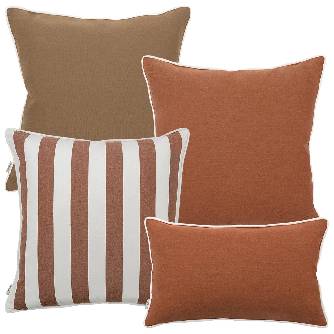 This four-piece cushion set comes in earthy tones of brown and rust for a warm, inviting feel. Bold wide stripes and contrast piping add a modern flavour to this outdoor cushion set.