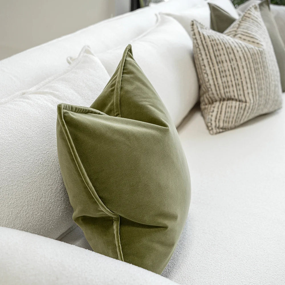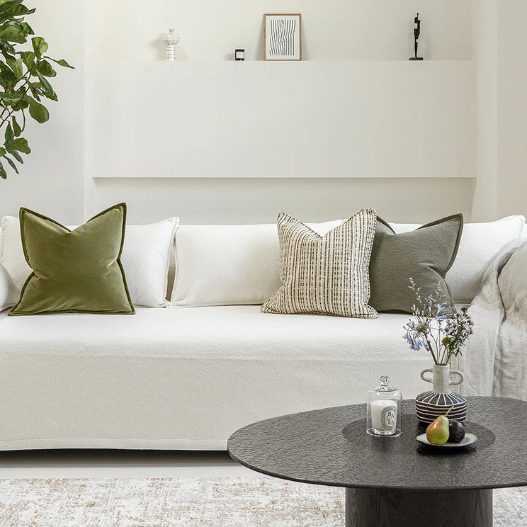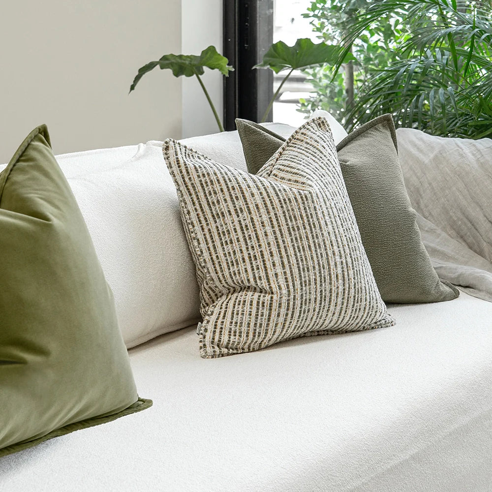 Transform your living space with these calming green cushions. This three-piece set features linen, velvet and dot pattern cushions in a green and cream palette to create a zen aesthetic.