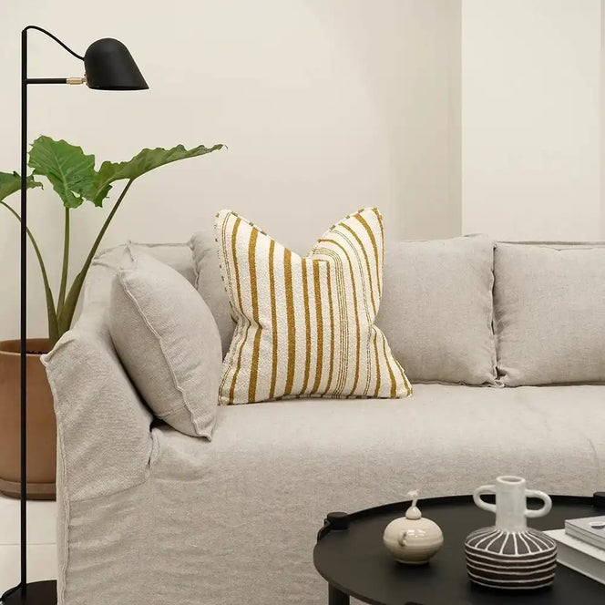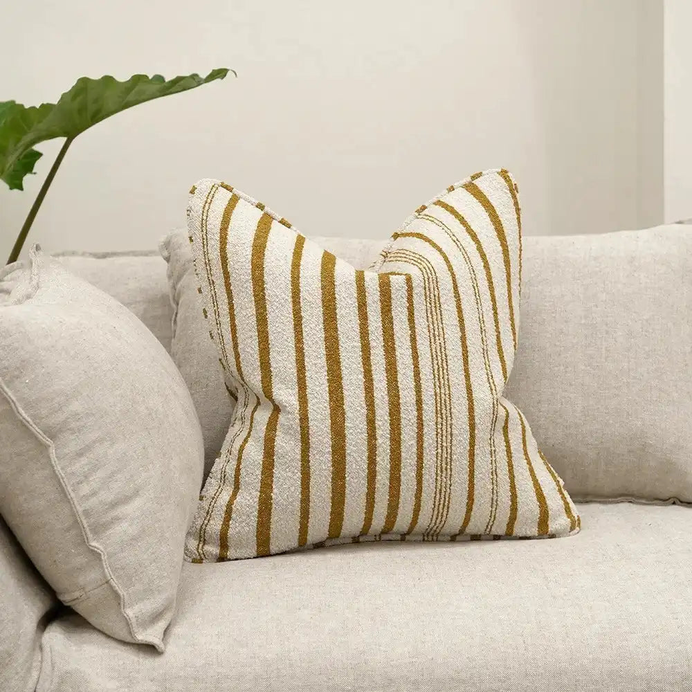 A textured cushion with muted ochre stripes over a soft ivory base. The gentle contrast and handcrafted rhythm of the lines lend warmth and effortless character to contemporary spaces.