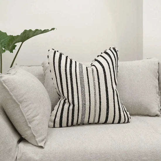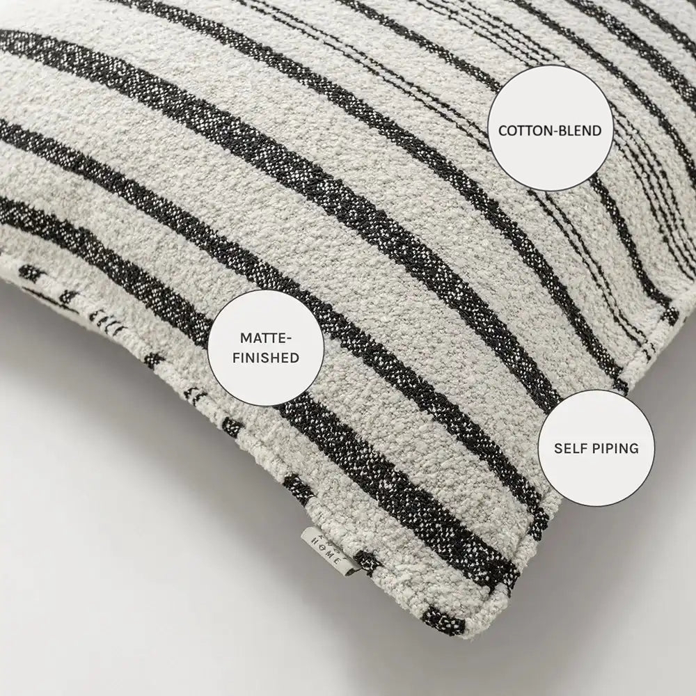 A modern take on classic stripes, this cushion pairs deep charcoal lines with a soft ivory base. Its textured surface adds a relaxed, tactile balance to clean, minimalist interiors.