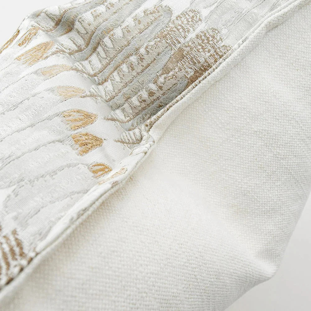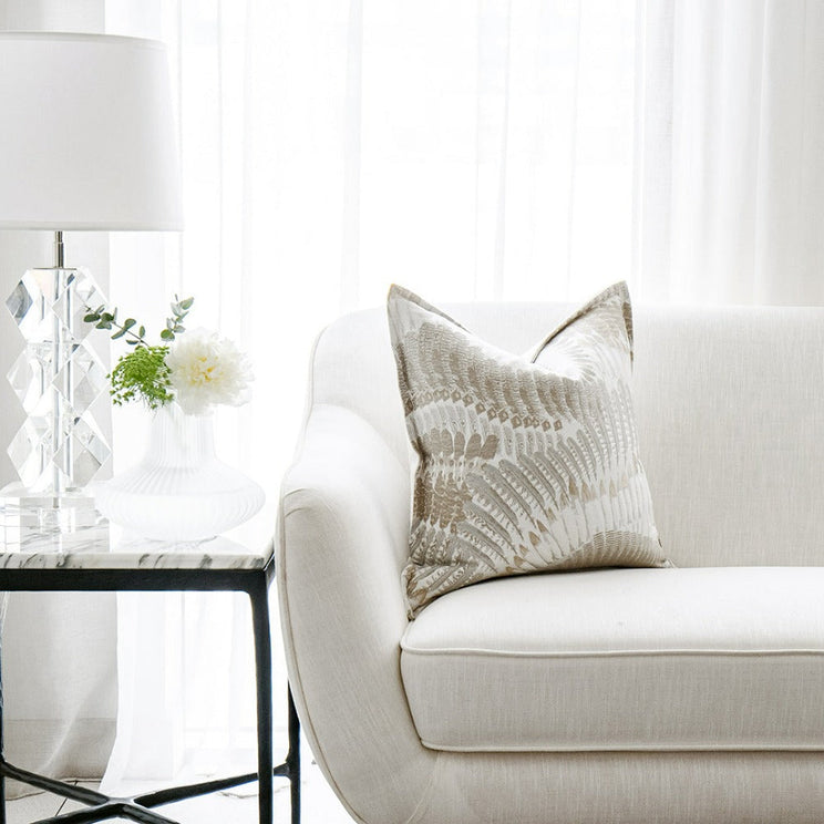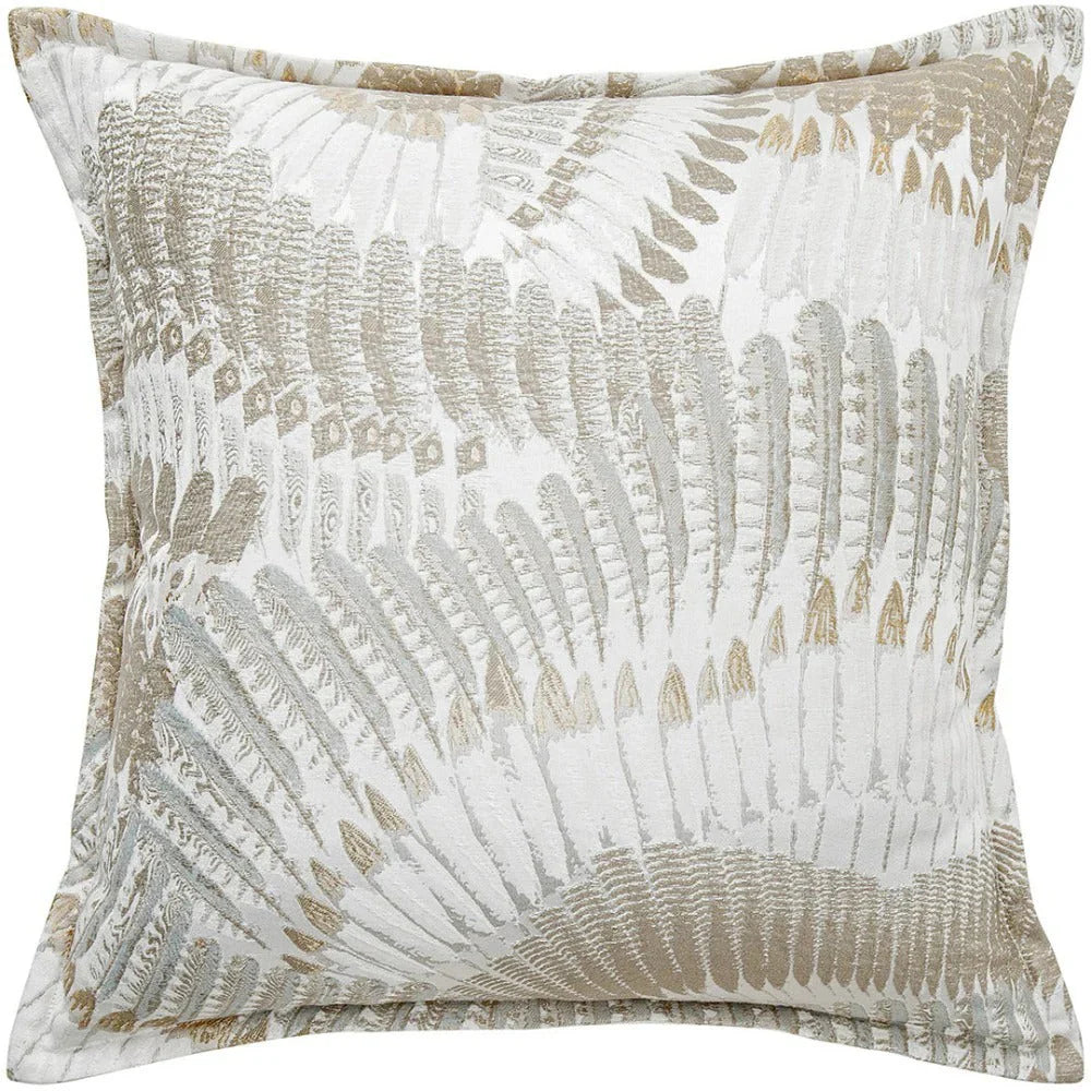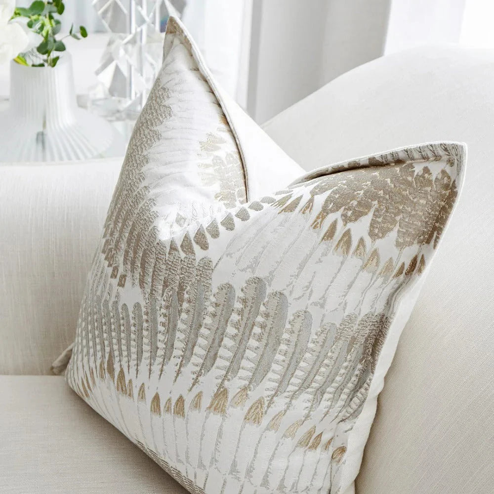 This modern cushion has a lightness of touch for a contemporary feel. The white cushion has a gold and silver feather pattern dancing across the front – a breath of fresh air for your home.