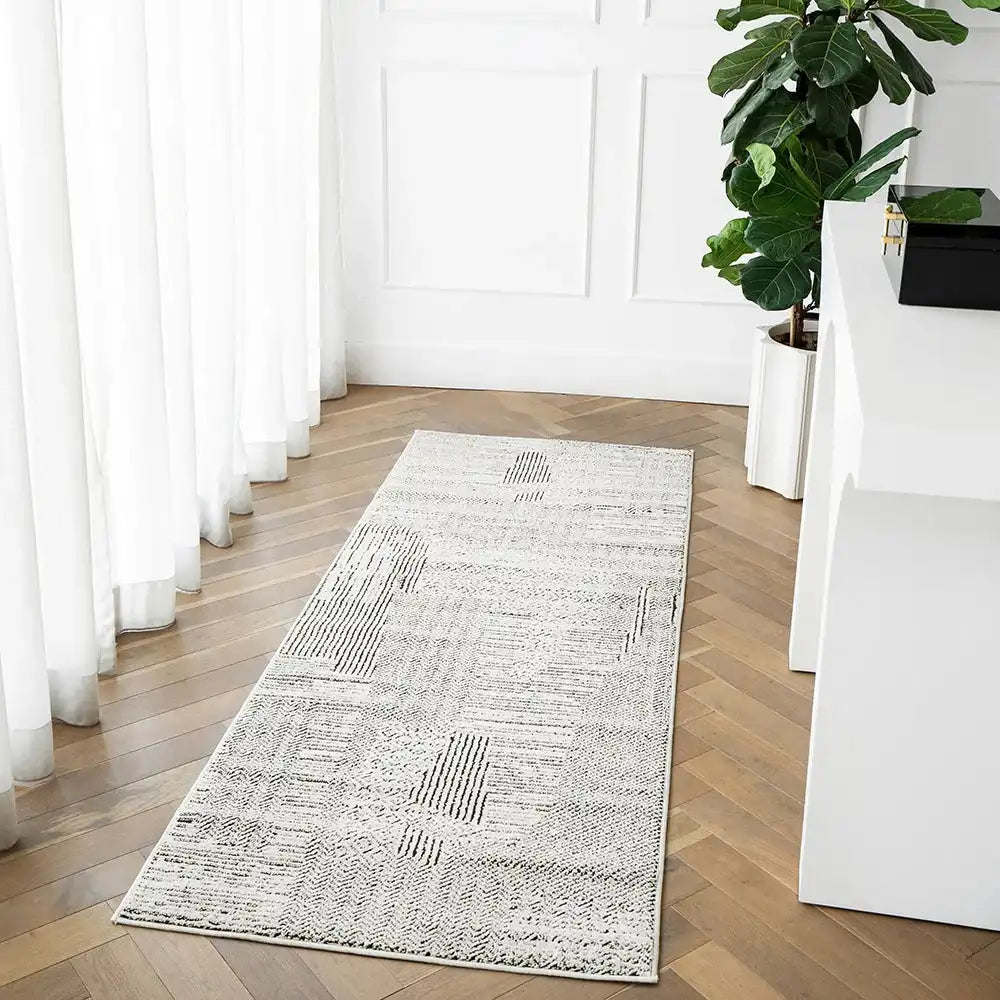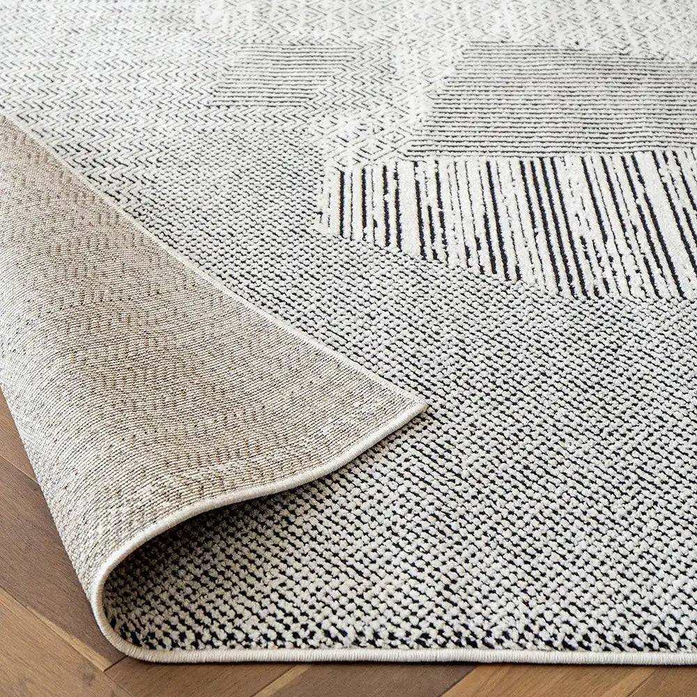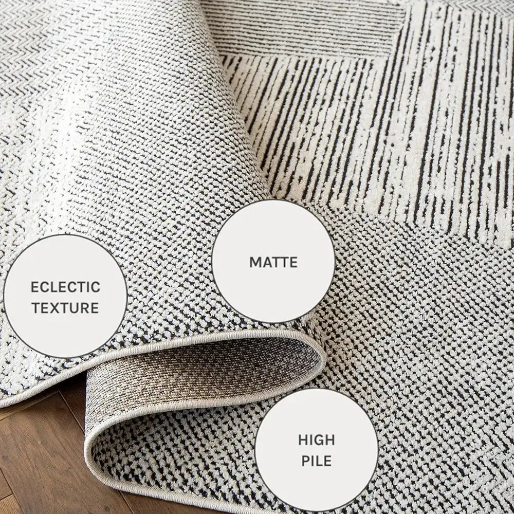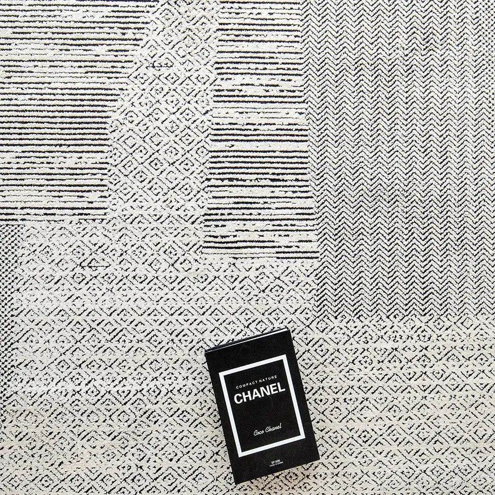 This black and white carpet mixes patchwork patterns with cosy textures to bring your living space alive.