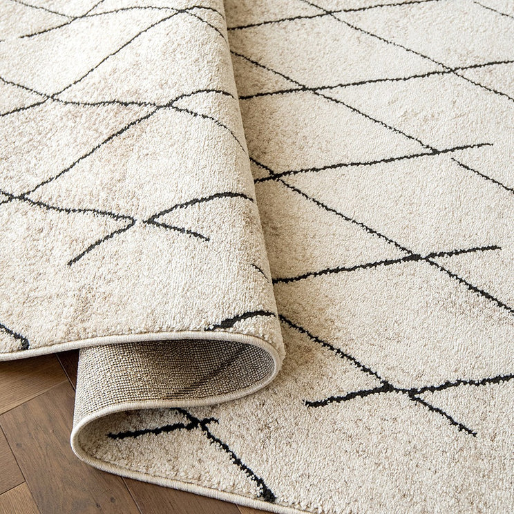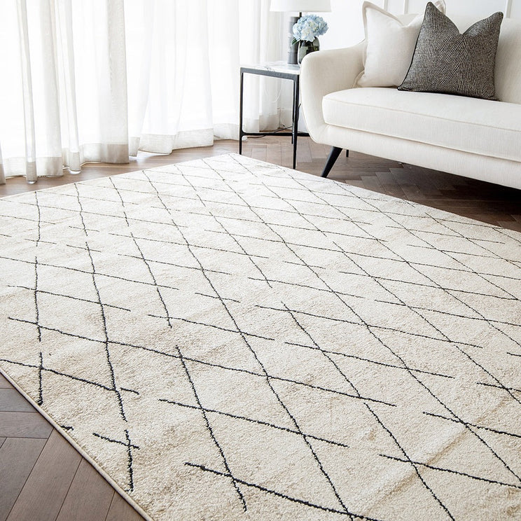 This Berber-style black and beige carpet combines geometric diamond shapes with with cosy textures to stylish effect.