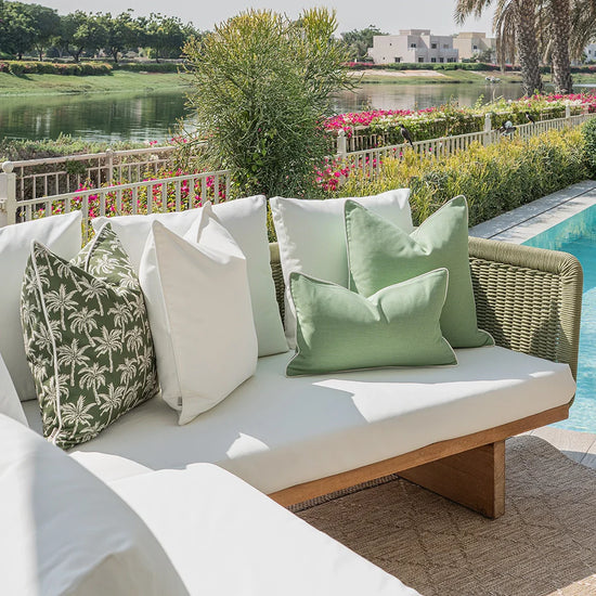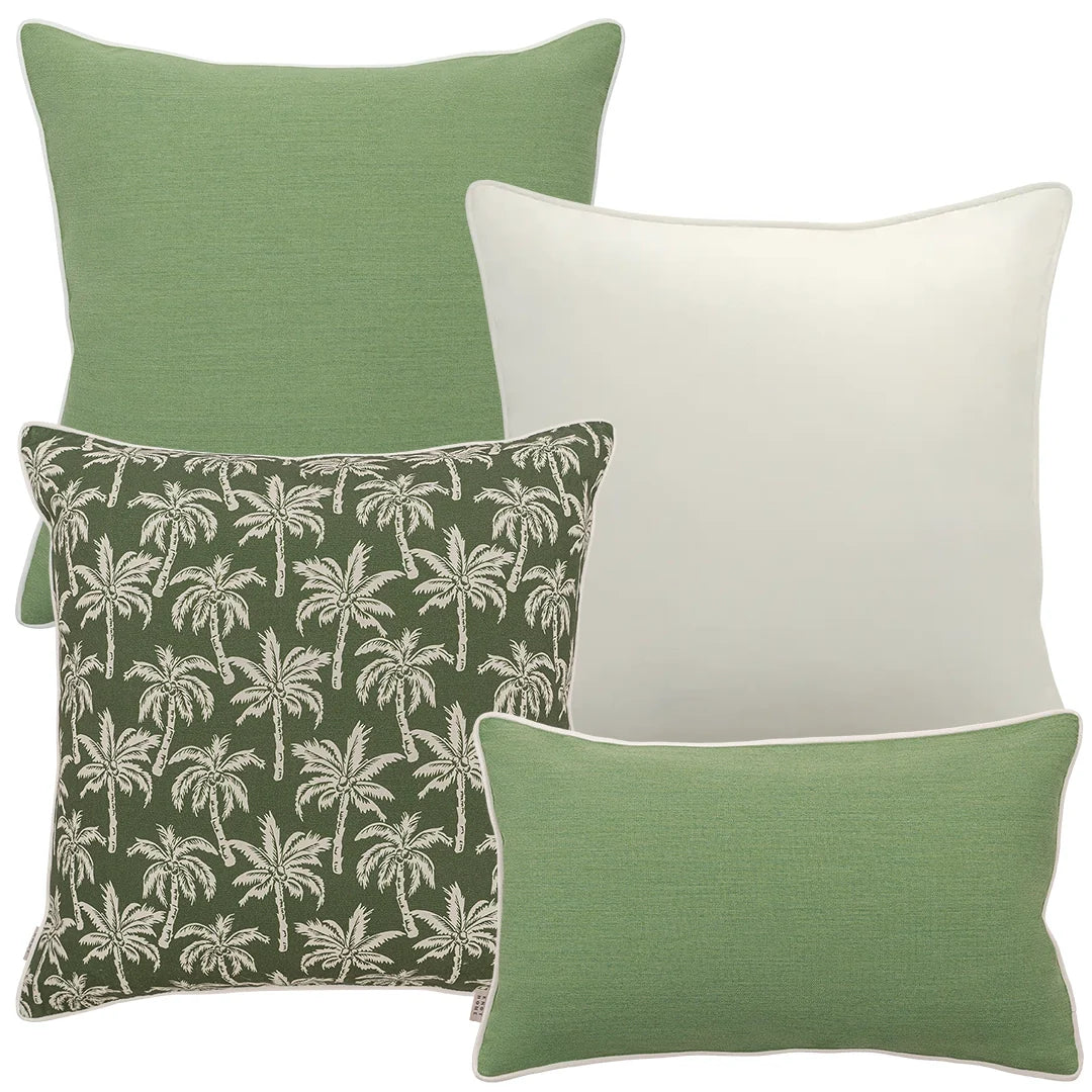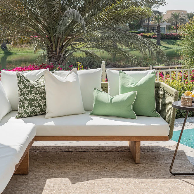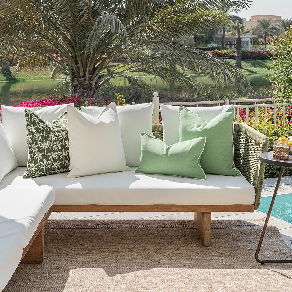 In shades of green and ivory, this four-piece cushion bundle will blend beautifully with your outdoor space. The set includes a palm print cushion to make coffee on the patio feel like a vacation.