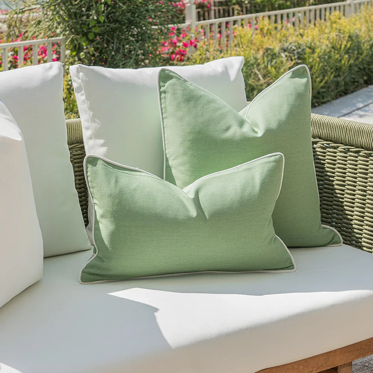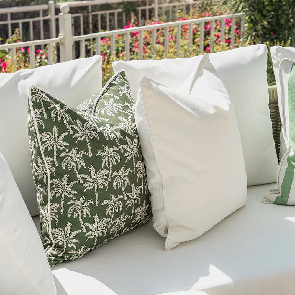 Design: One green, one ivory, one palm tree design and one accent cushion, all with piping