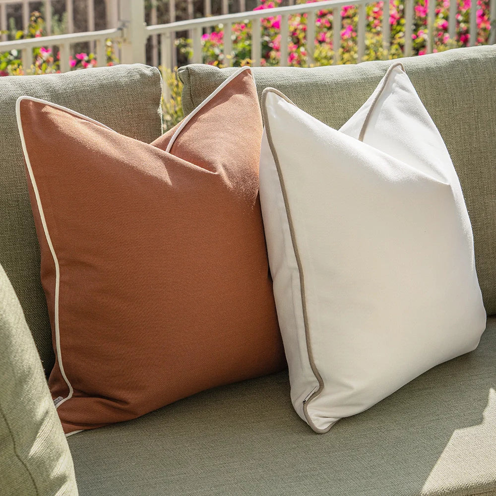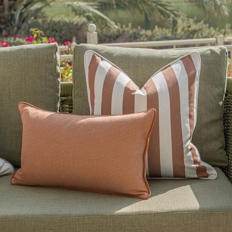 Warm, earthy colours meet bold, modern stripes in this outdoor cushion set. Expertly blending plain and striped cushions, this ivory and rust cushion bundle will transform any patio.