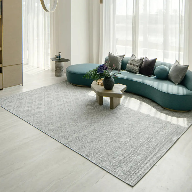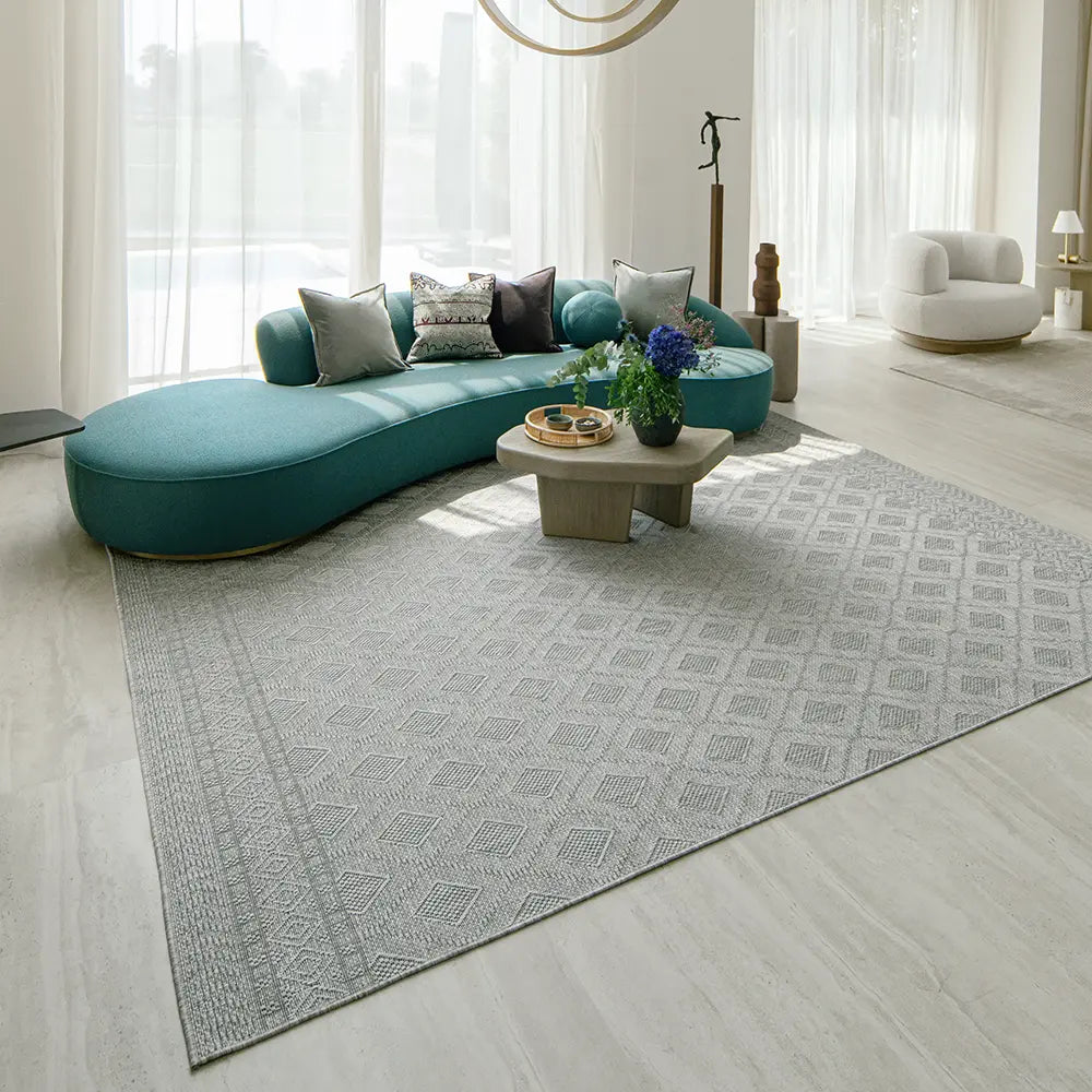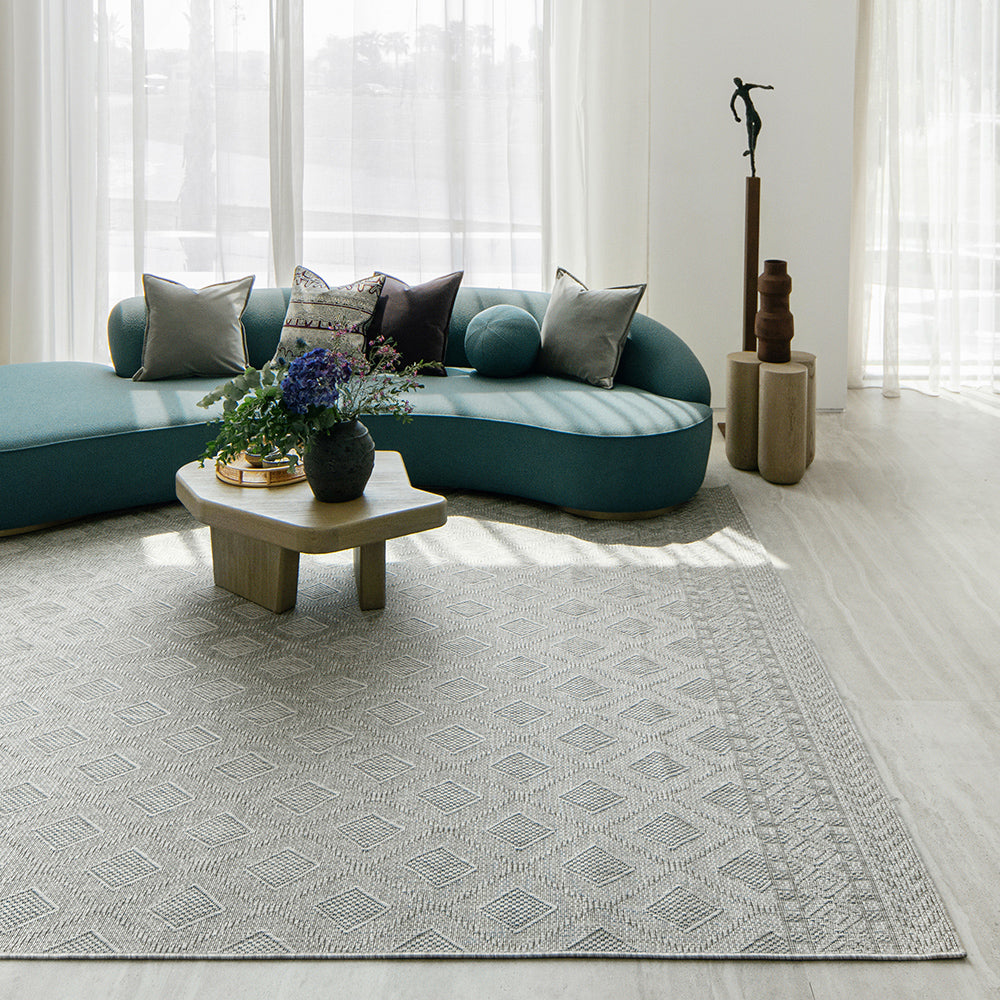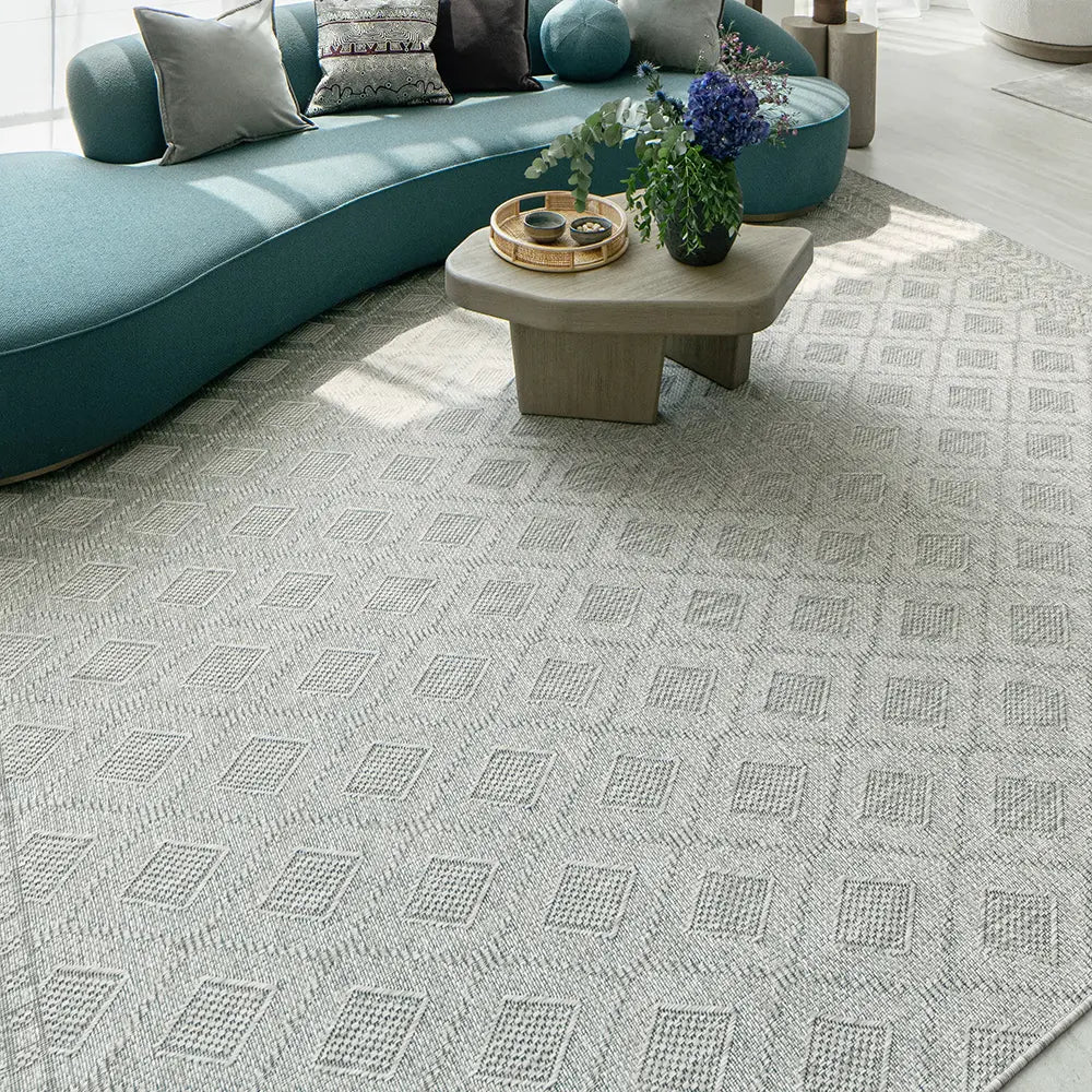 A regular geometric pattern updates traditional carpet design