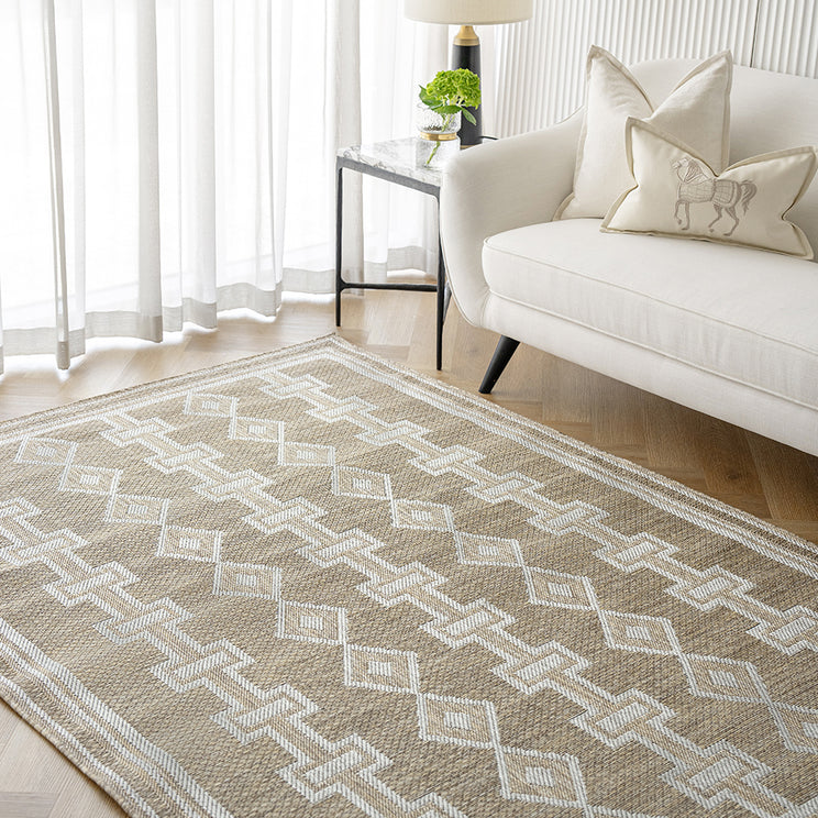 In golden brown and white, this patterned carpet has a rustic aesthetic. It's the perfect finishing touch for a modern interior.
