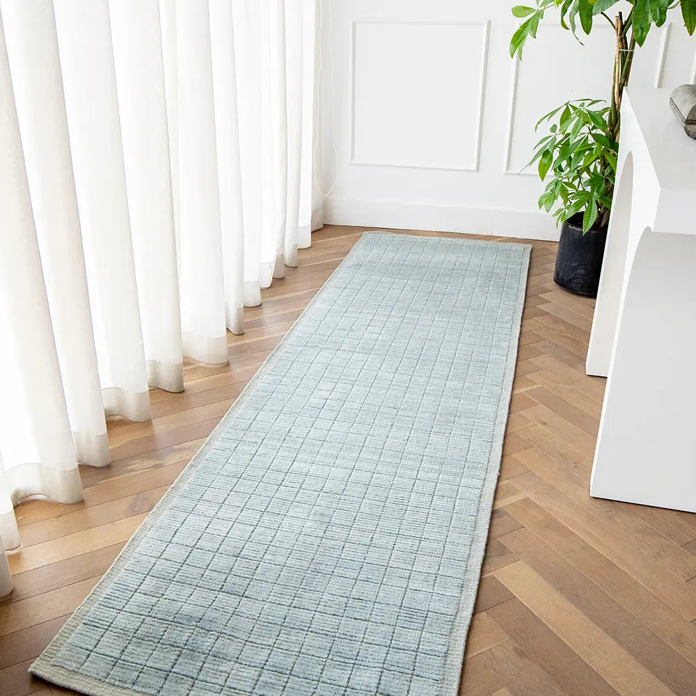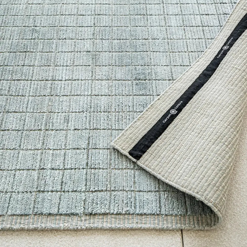 This blue and grey carpet combines a textured grid pattern with premium materials to define modern luxury.
