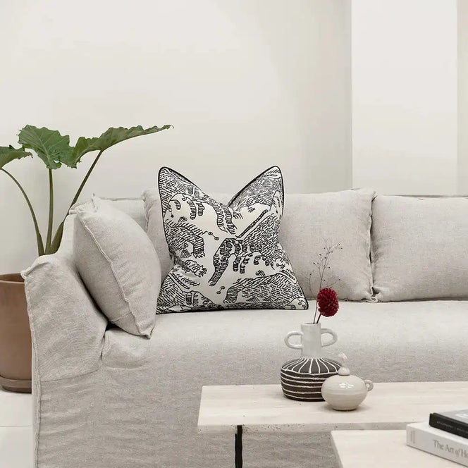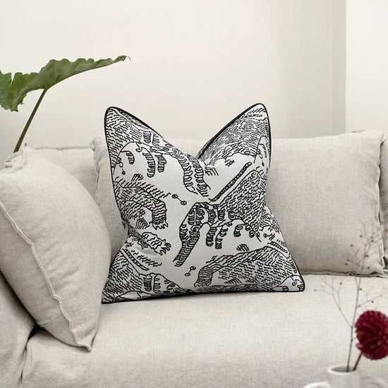 A striking cushion featuring abstract, embroidered linework in charcoal on an ivory base, finished with refined black Leatherette piping. The bold pattern adds character and a crafted sophistication to modern interiors.