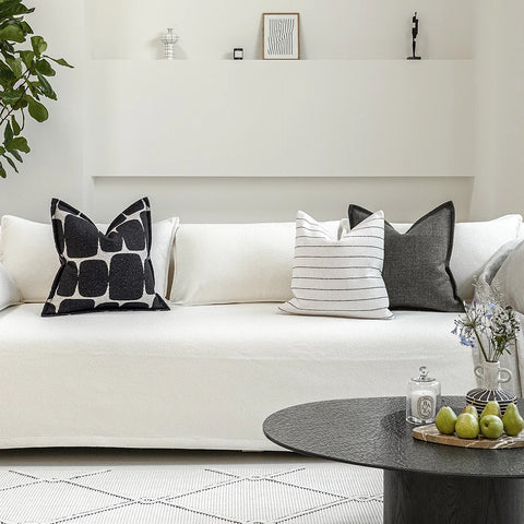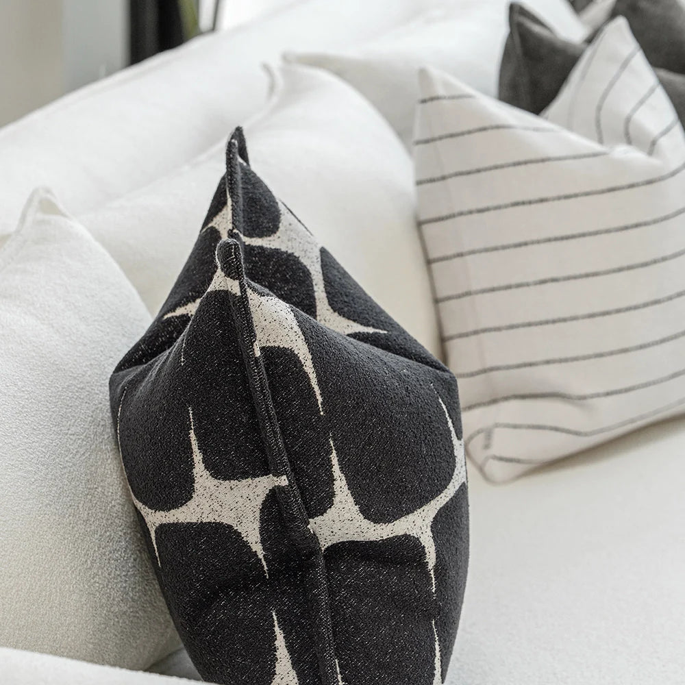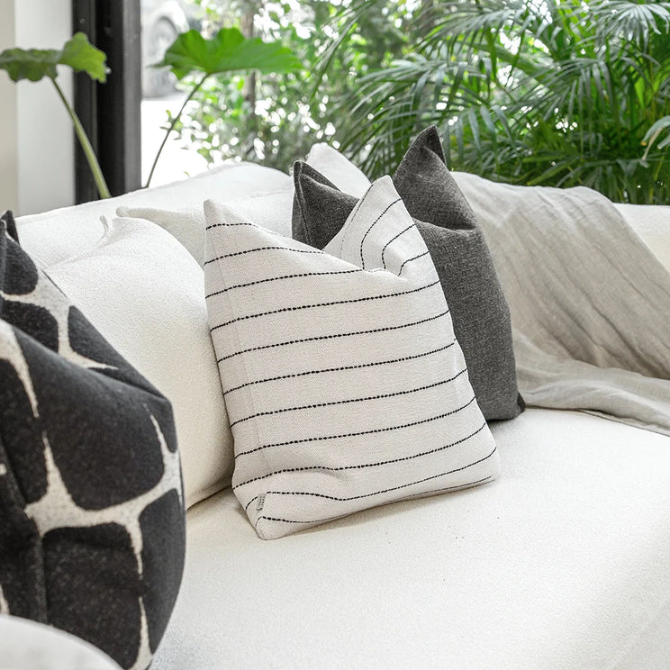 Refresh a minimalist space with this grey, black and white cushion bundle. Mixing plain and striped cushions with a playful rectangle design, these monochrome cushions deliver a crisp seasonal update.