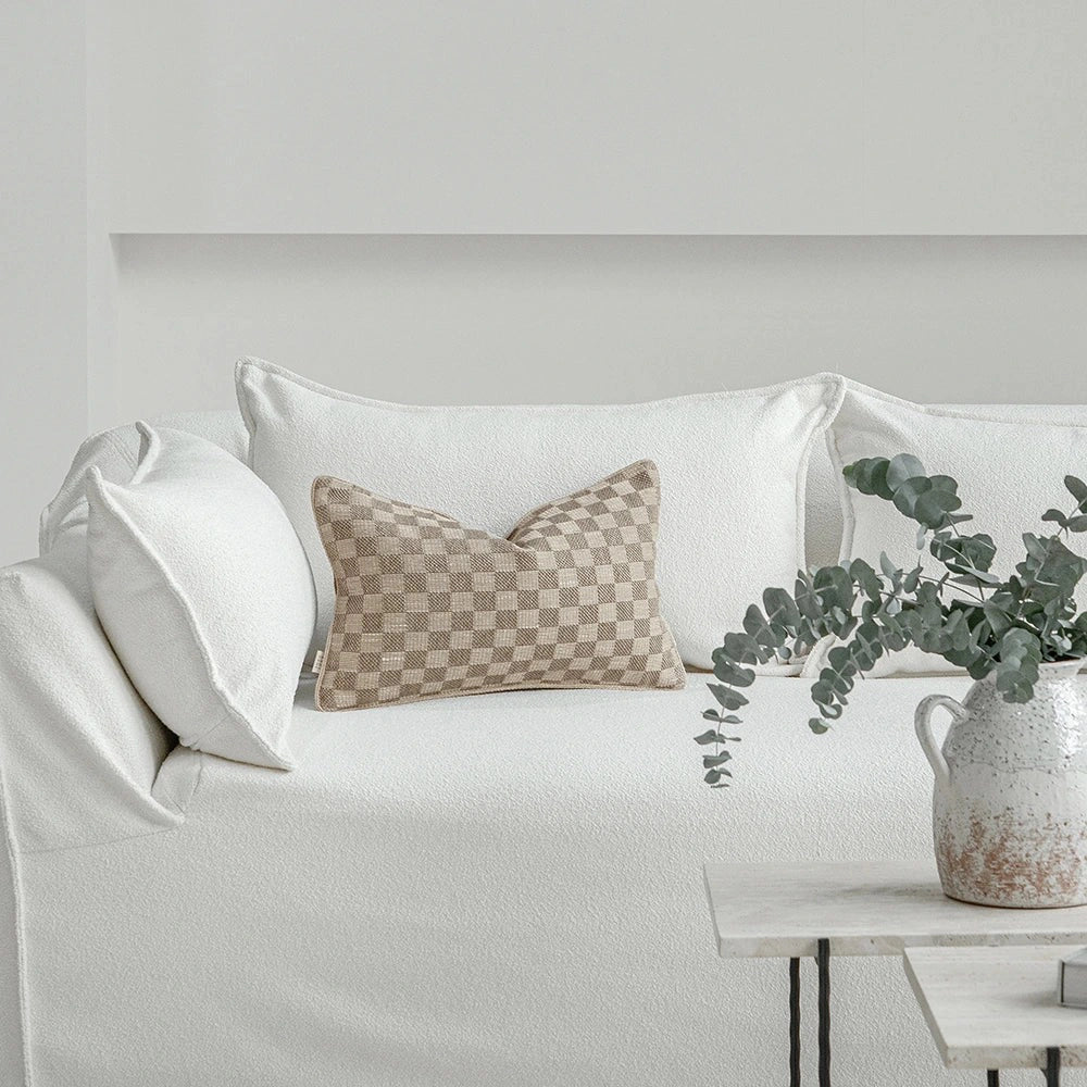 Design: Designed with a modern checkerboard weave, alternating between smooth and tactile squares for subtle depth. The pattern is fully woven—not printed—giving it a rich artisanal character. Finished with a matching edge for a clean, cohesive look that blends seamlessly into layered interiors.