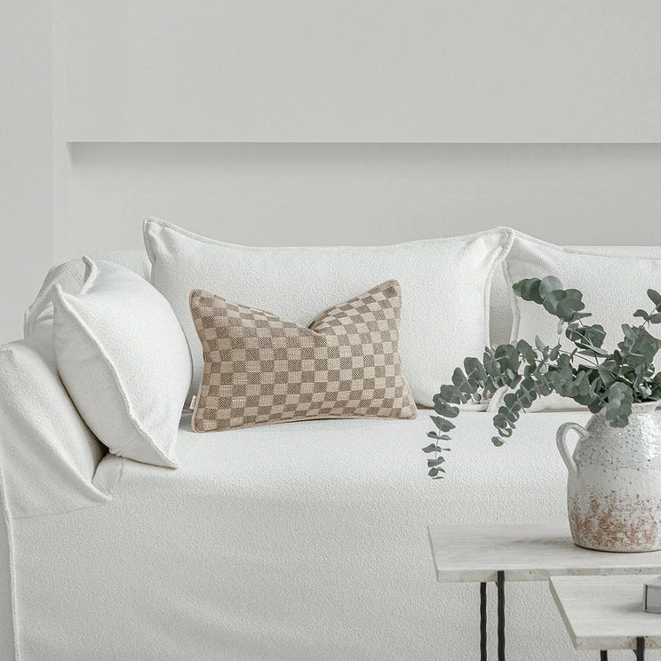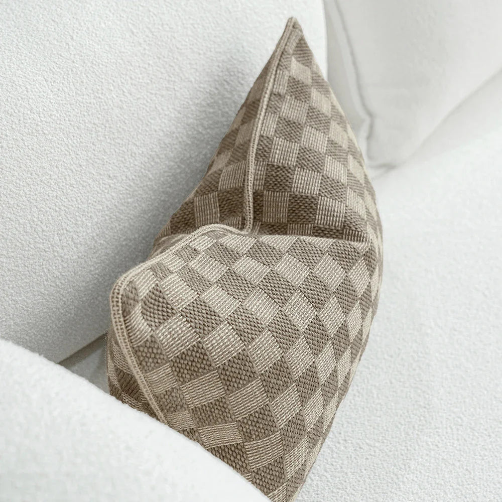 A beautifully textured cushion featuring a refined two-tone weave that feels both structured and soft. Its muted, earthy tone grounds the space while the elevated craftsmanship adds quiet sophistication.