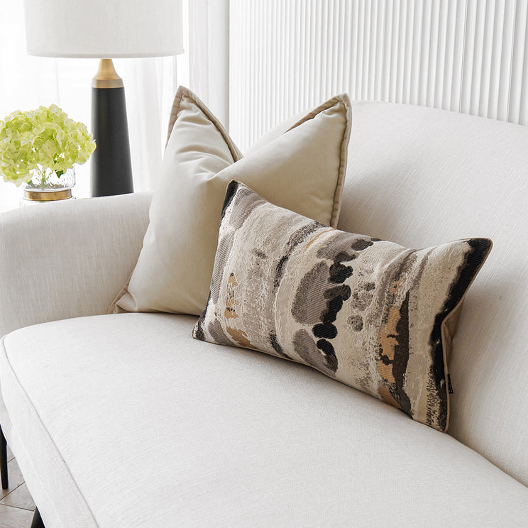 Design: Two light beige velvet cushions and an abstract accent cushion with gold back