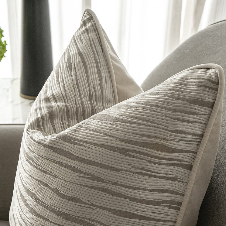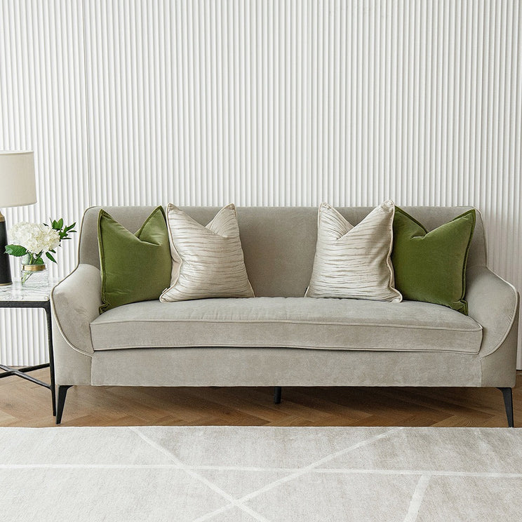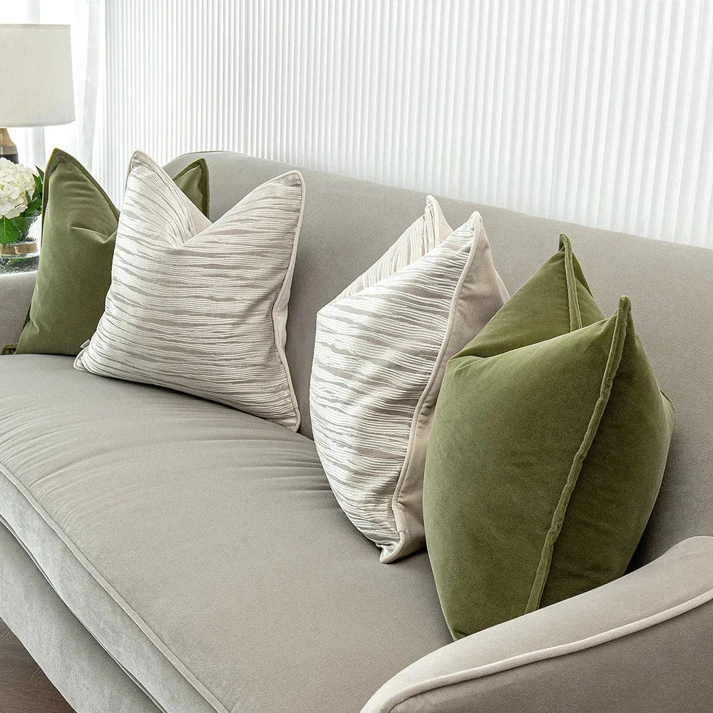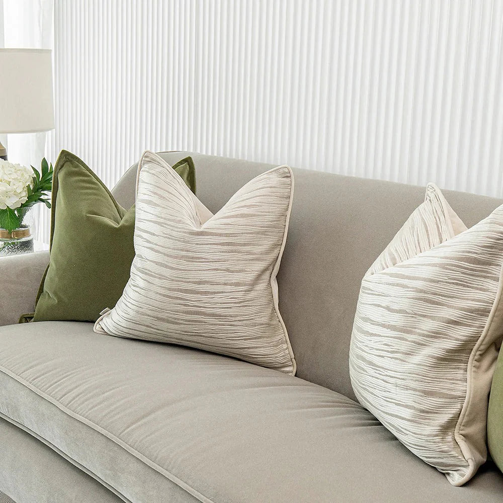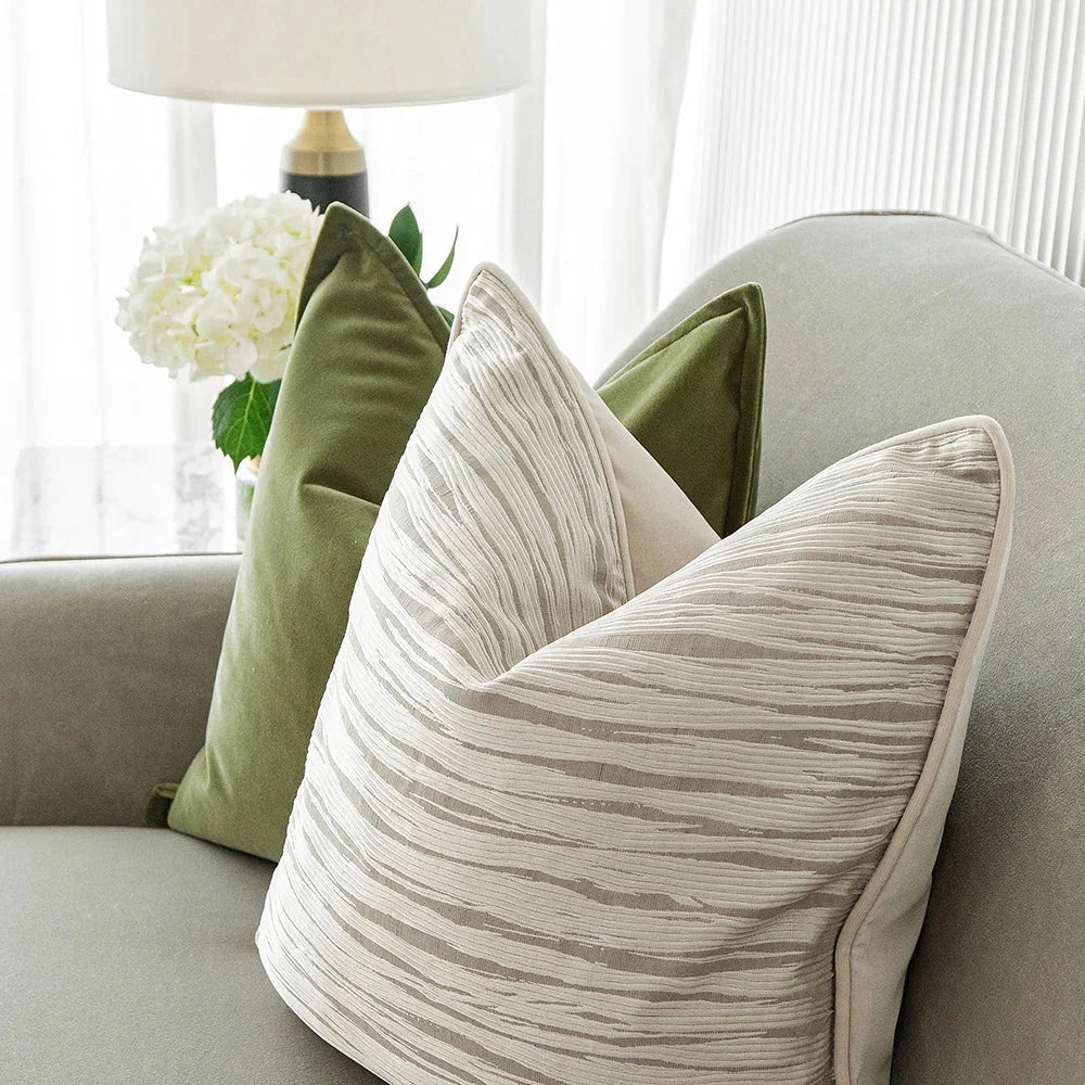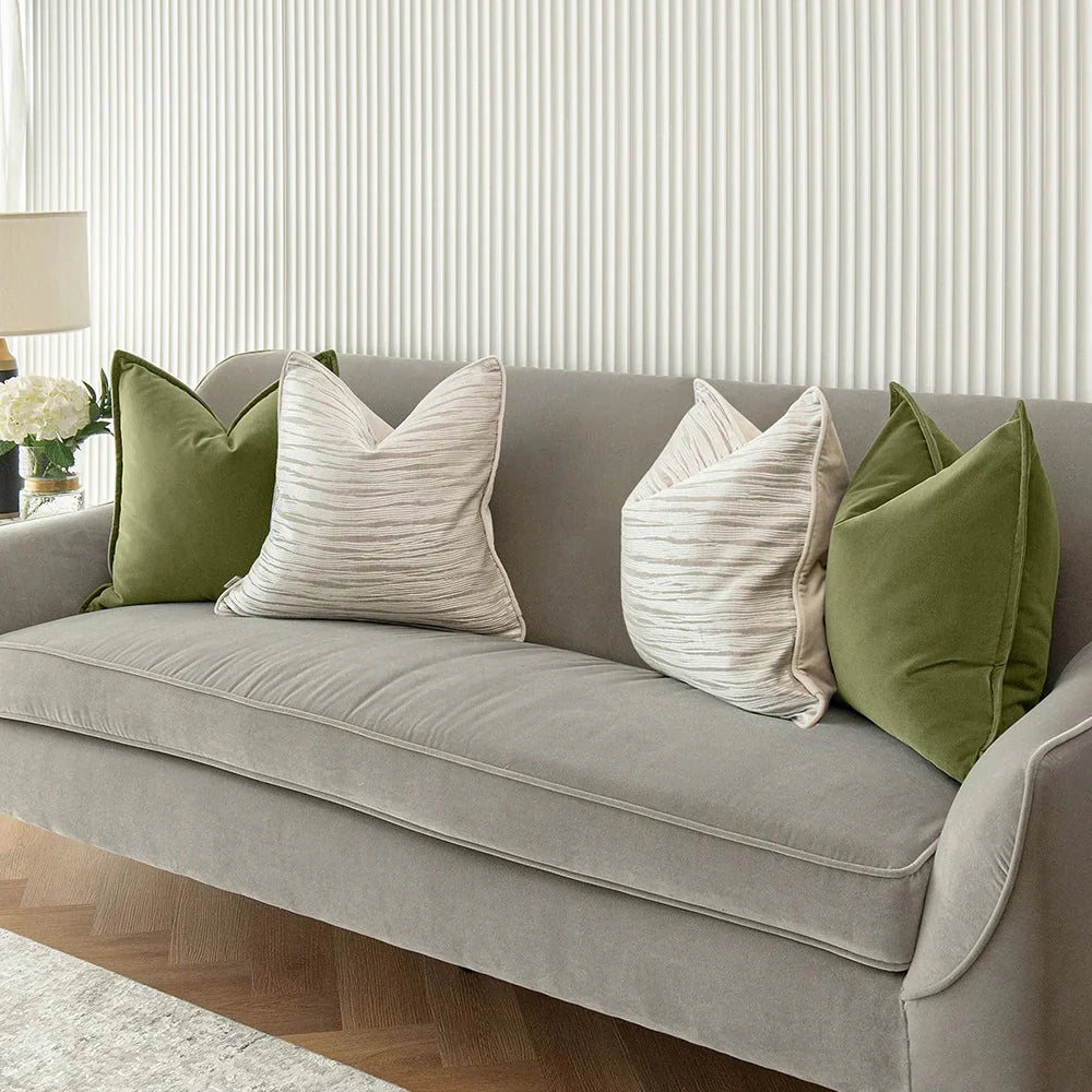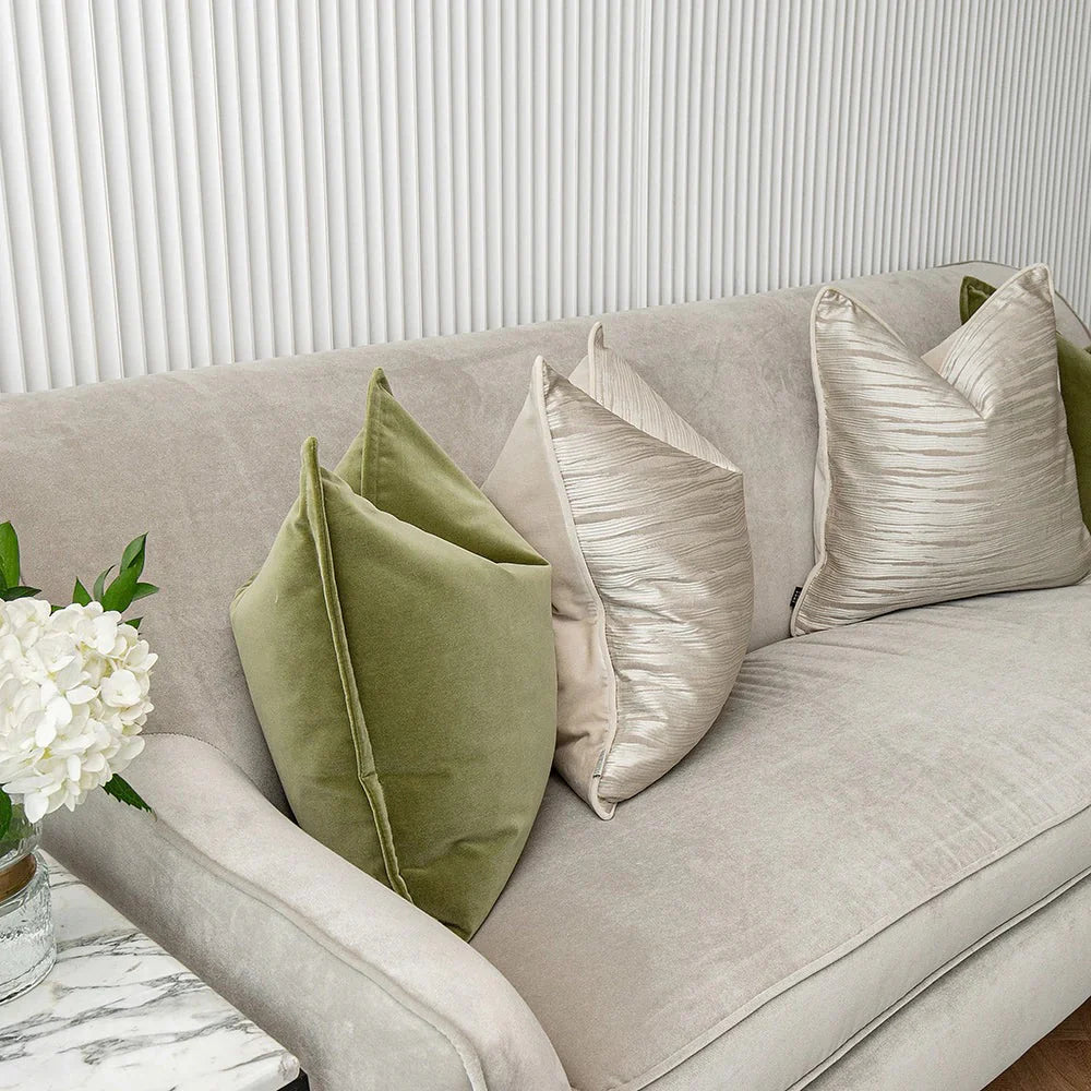 Design: Two jade velvet cushions and two beige cushions with a silver ripple pattern on the front