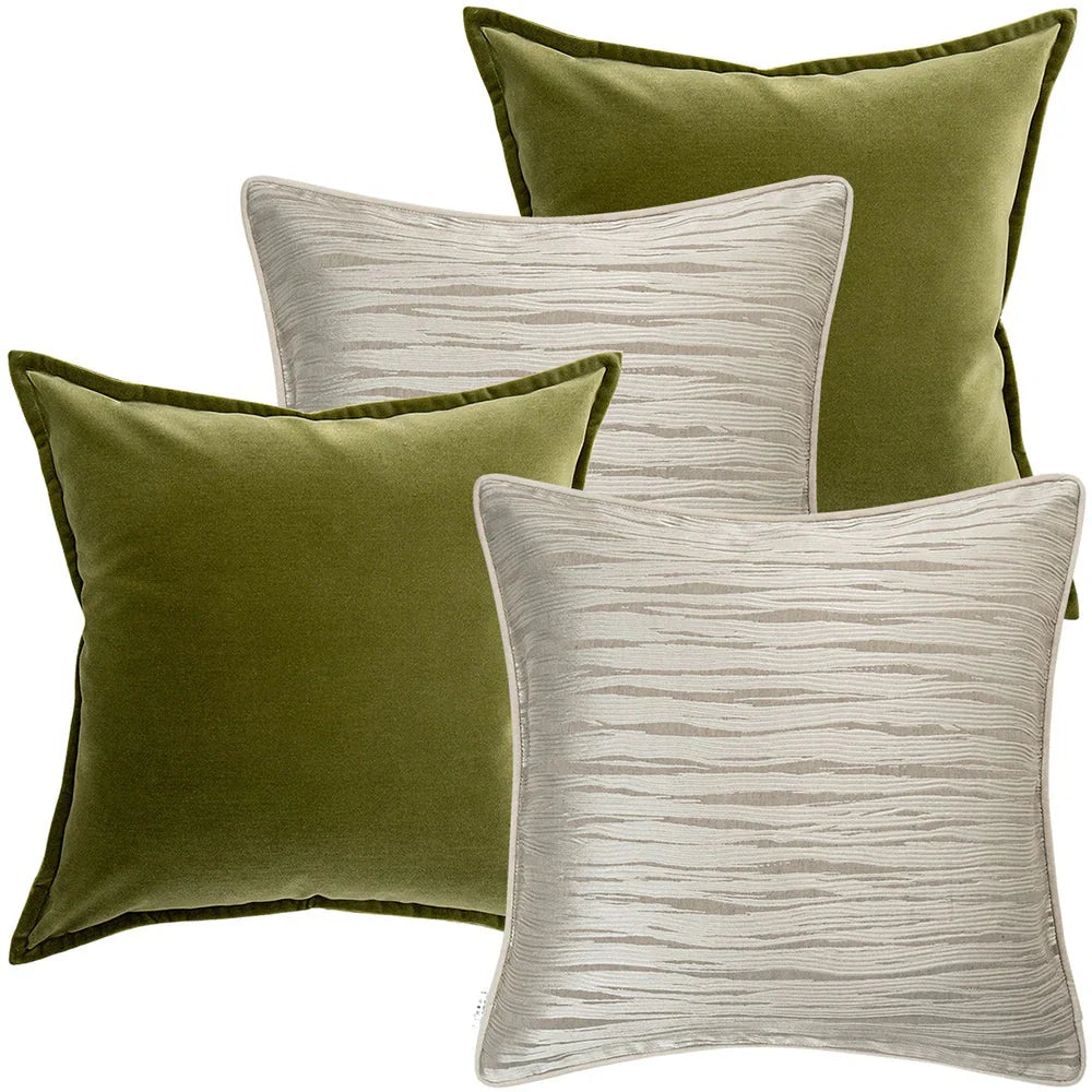 In calming shades of green and beige, this cushion bundle will create a relaxed ambience in your living space. It pairs two green velvet cushions with two smooth cushions with a silver ripple design.