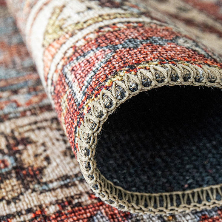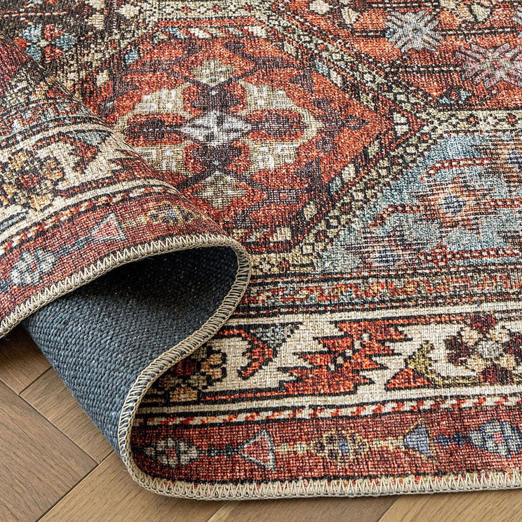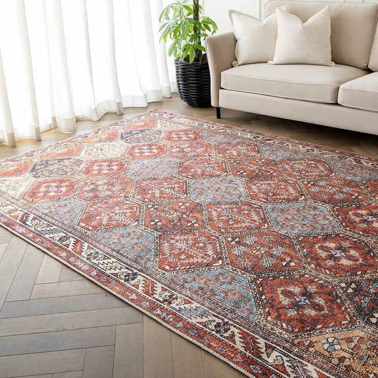 In a vibrant mix of reds with accents of blue and green, this colourful rug will brighten up your living space.