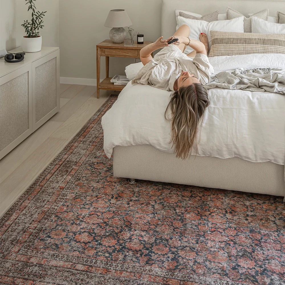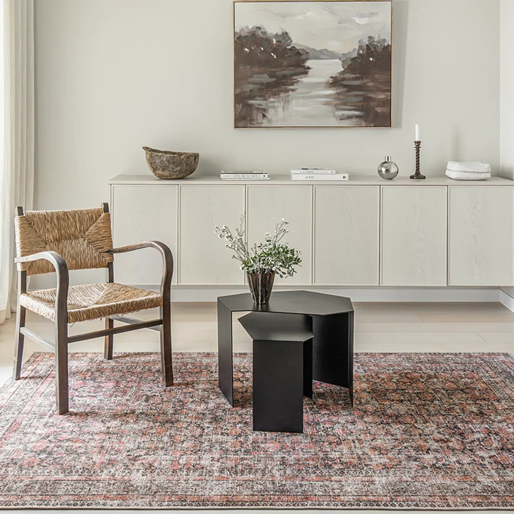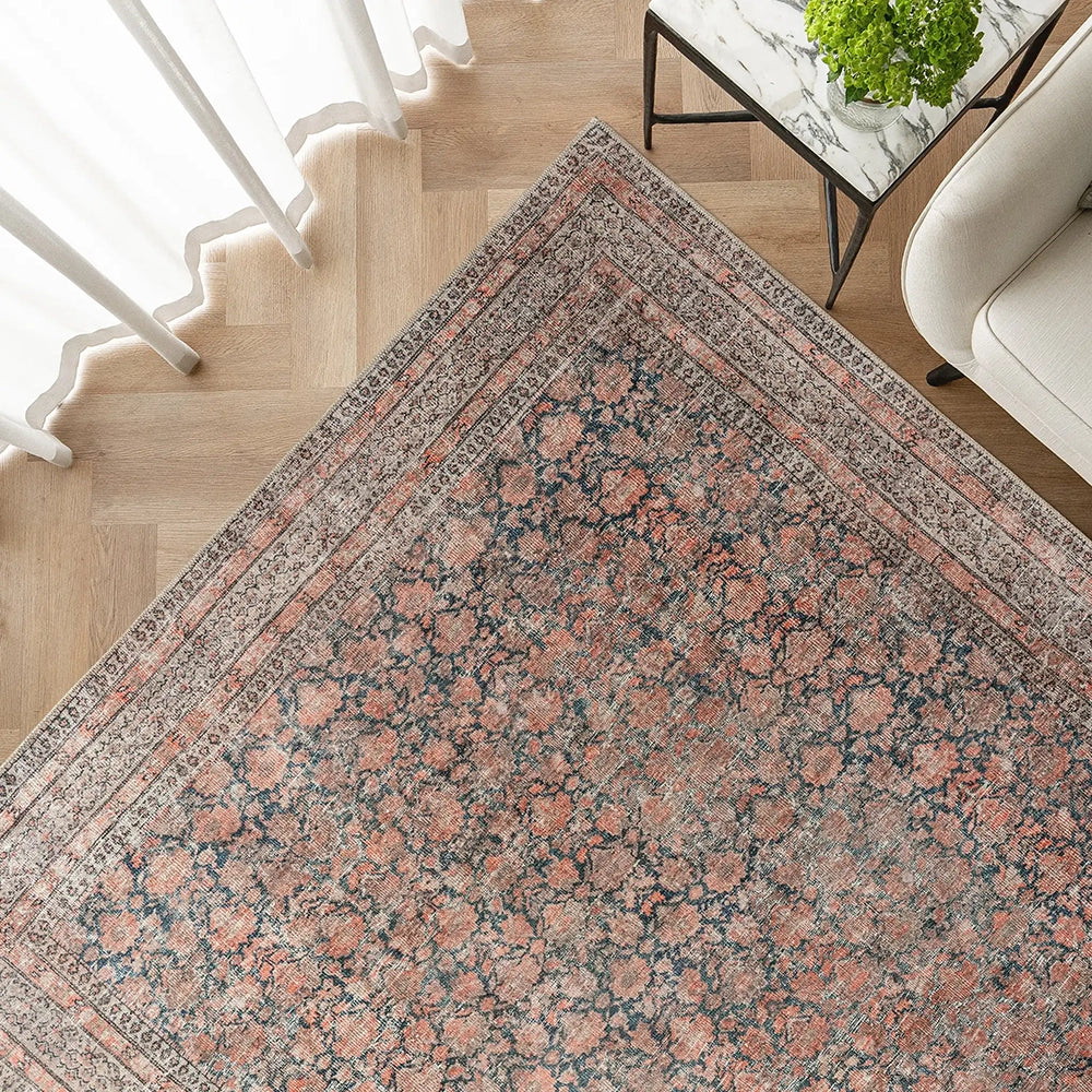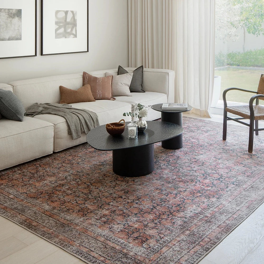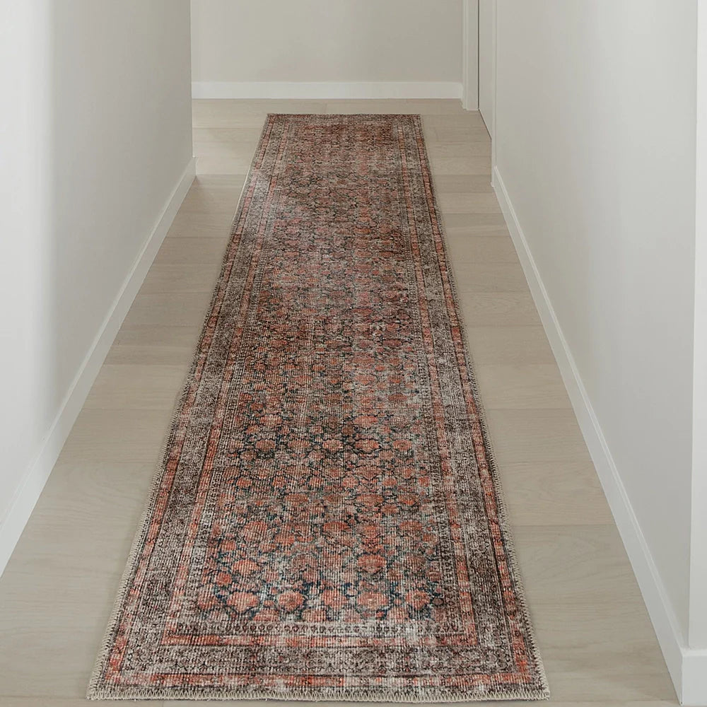Bring a taste of the countryside to your home with this faded carpet. In warm shades of terracotta, charcoal and rust, the floral carpet is a versatile option for both rustic and urban interiors.