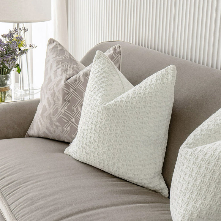 This bundle includes two white cotton cushions and two taupe cushions with an oversized interlock pattern on the front and a faux leather back. It’s an elegant way to make a sofa feel more luxurious.