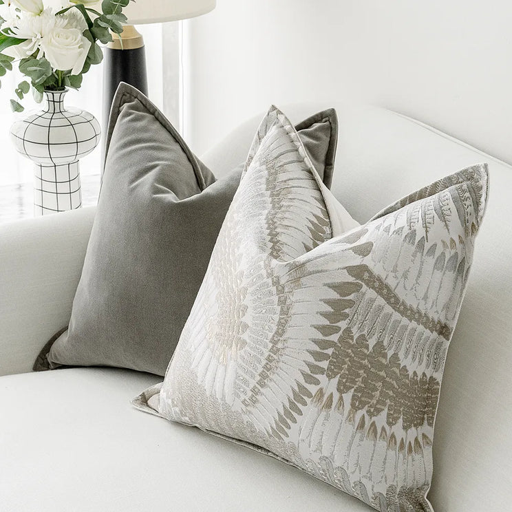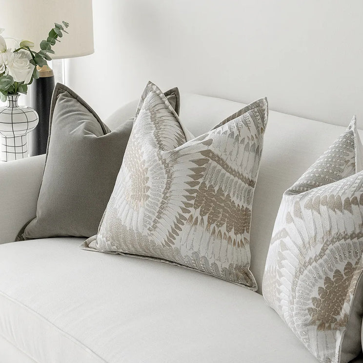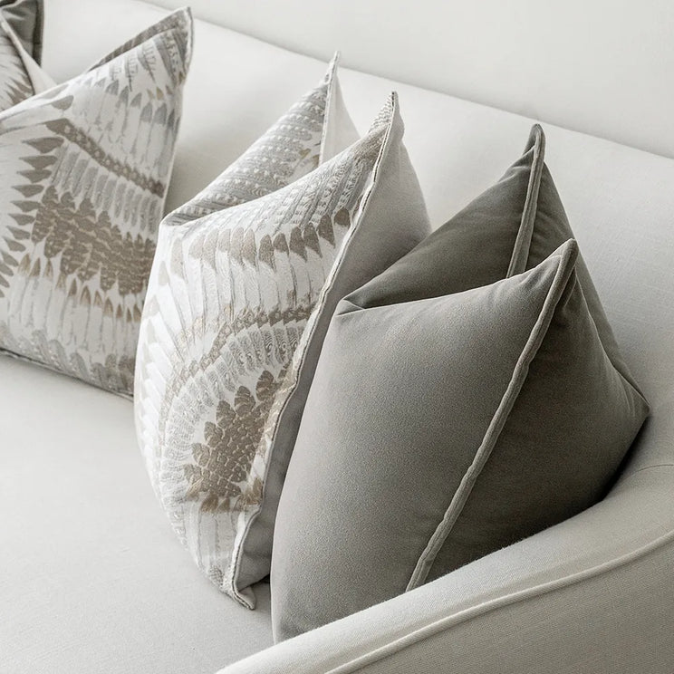 Refresh your living space with this luxury cushion bundle. The four-piece designer set teams two plush velvet cushions in pale grey with two feather pattern cushions for a light and airy feel.