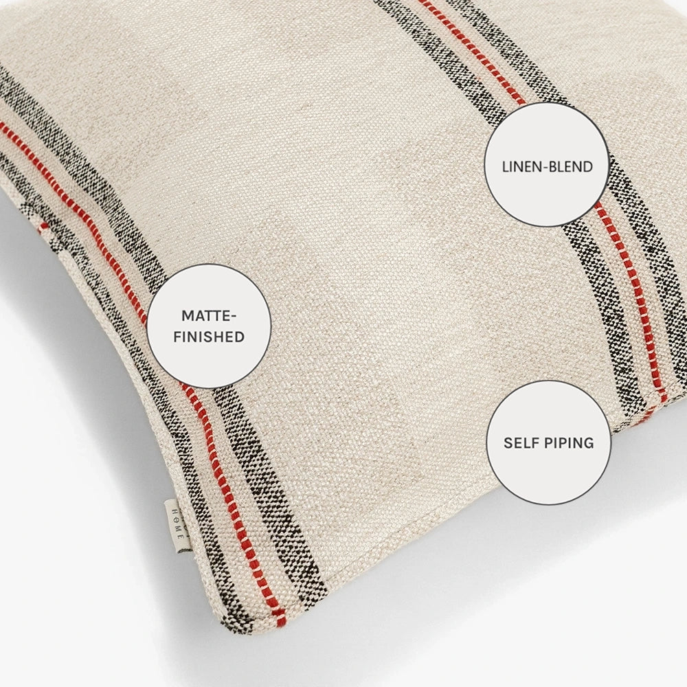 Design: Features a woven block pattern softened into the base fabric, framed by double side stripes and a narrow center accent in muted red. The combination of charcoal detailing and warm undertones creates a refined, modern take on traditional hand-loomed textiles. The backing continues the same weave for a cohesive finish.