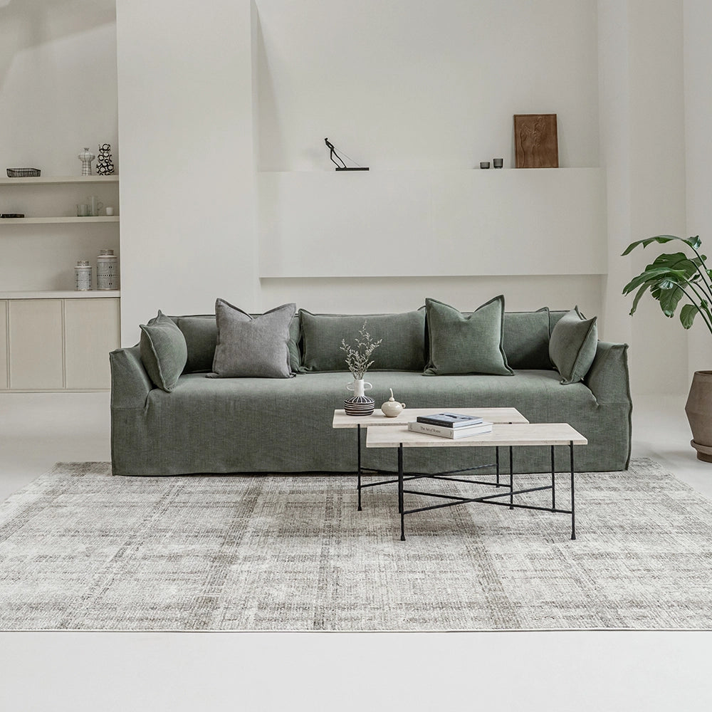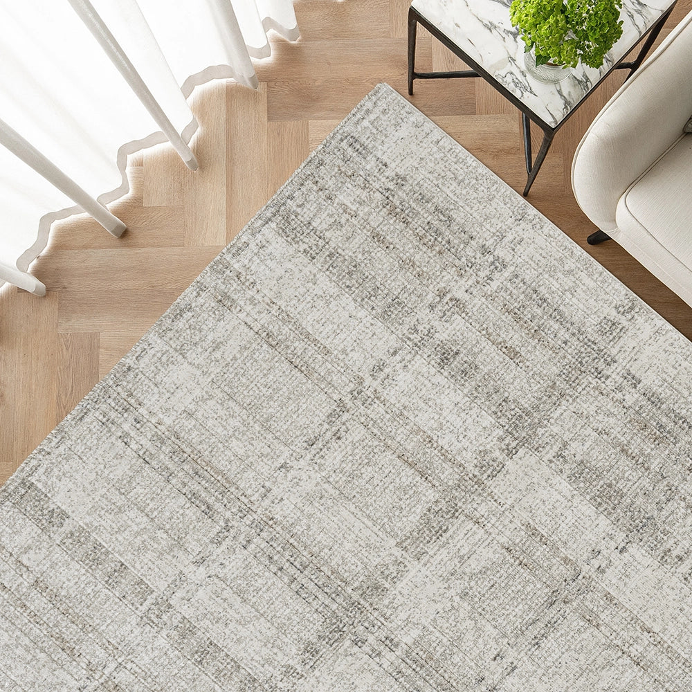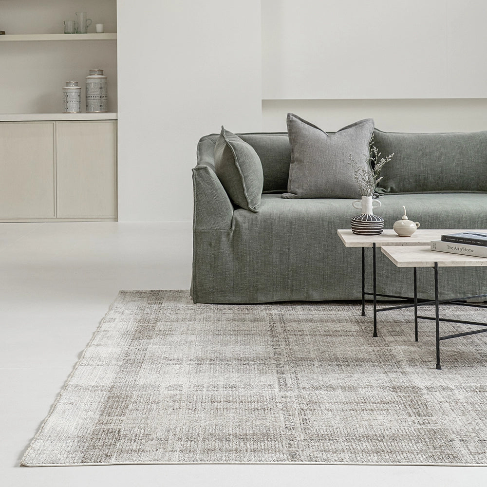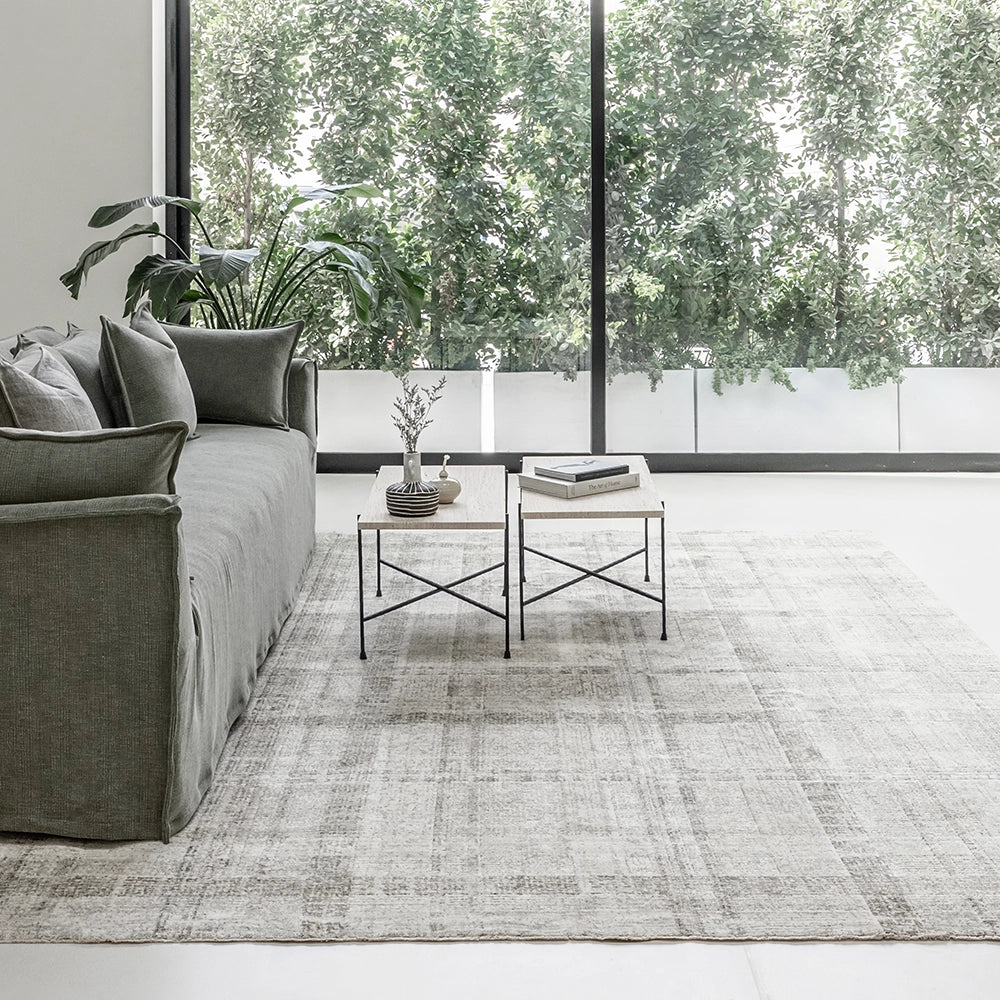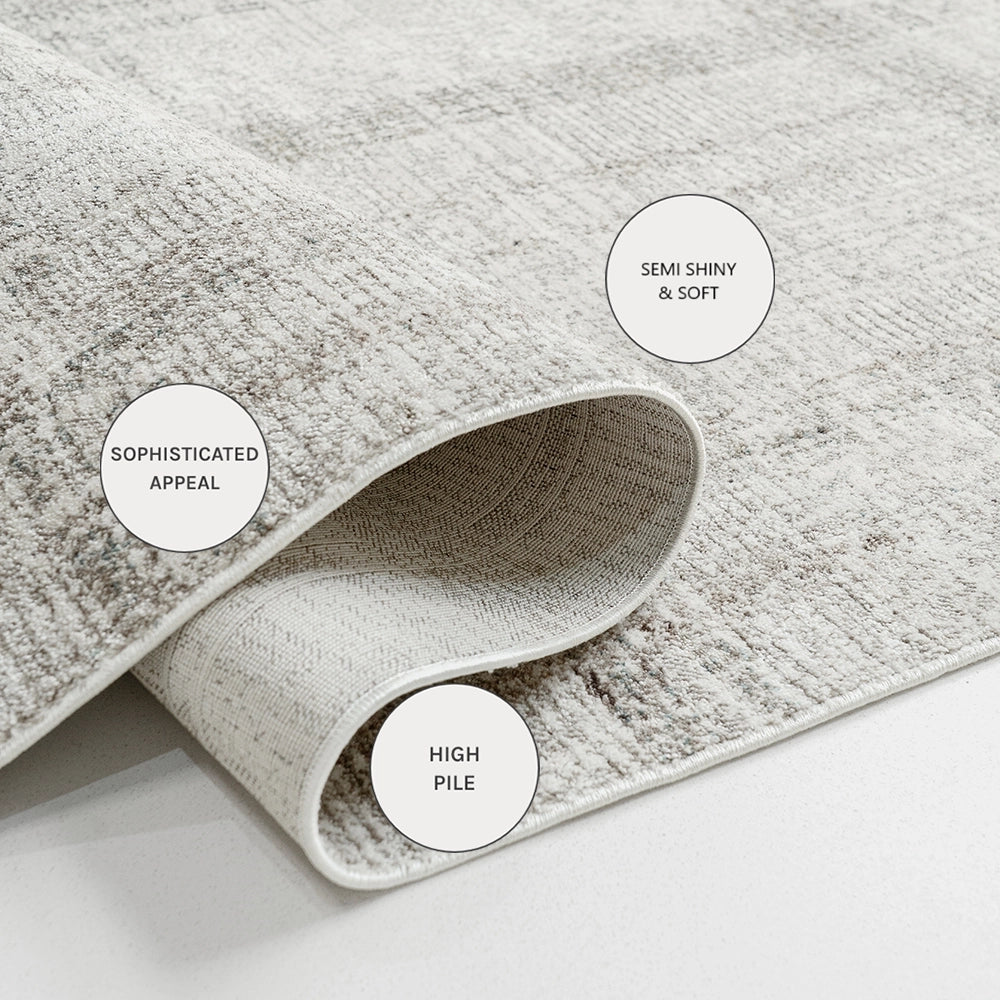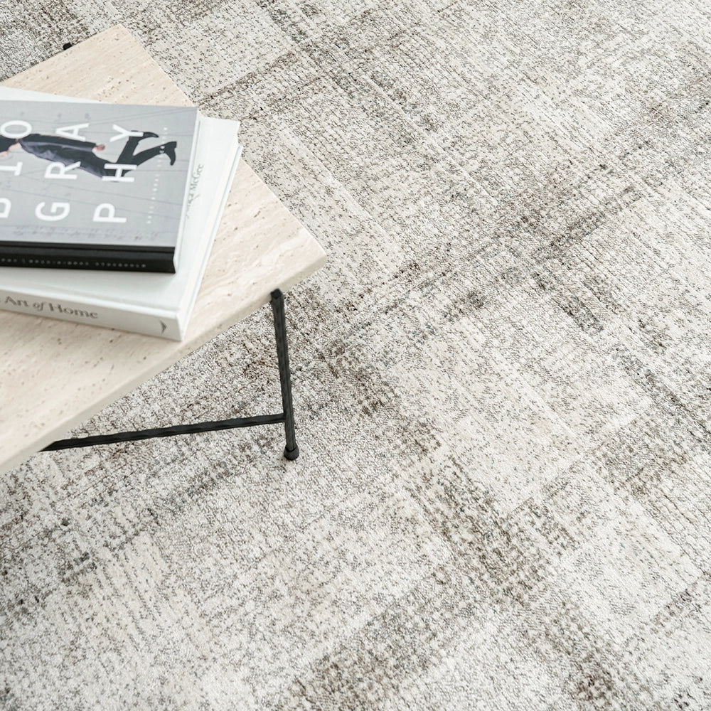 Мягкая основа цвета слоновой кости, переплетённая с оттенками серо-коричневого камня и лёгким оттенком шалфея, создаёт эффект слегка потёртой клетки. Гладкая поверхность с высоким ворсом и лёгкий блеск добавят изящную текстуру и теплоту в любую комнату.