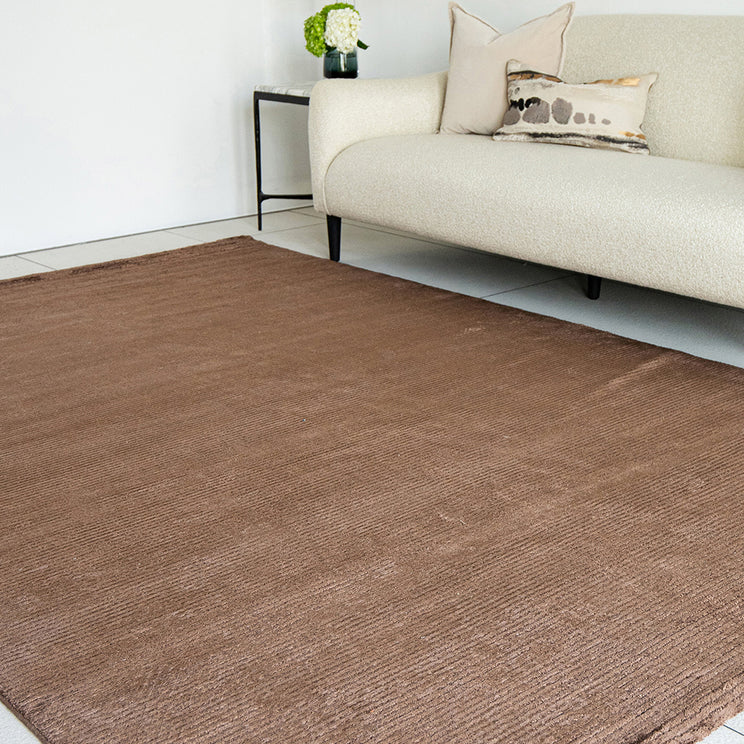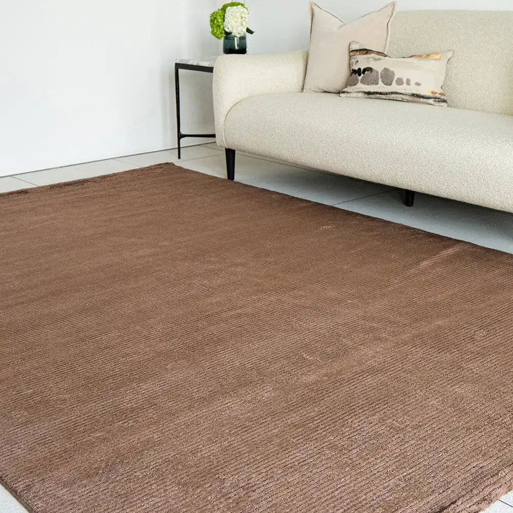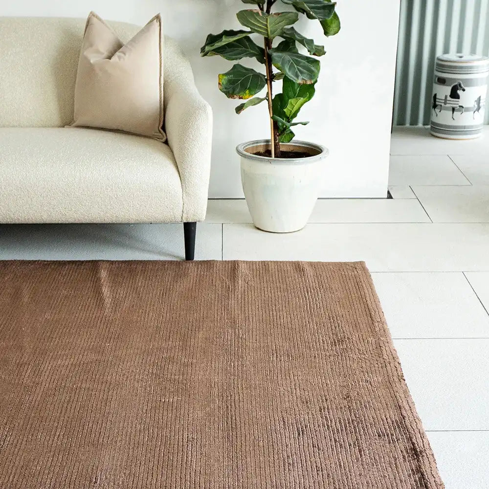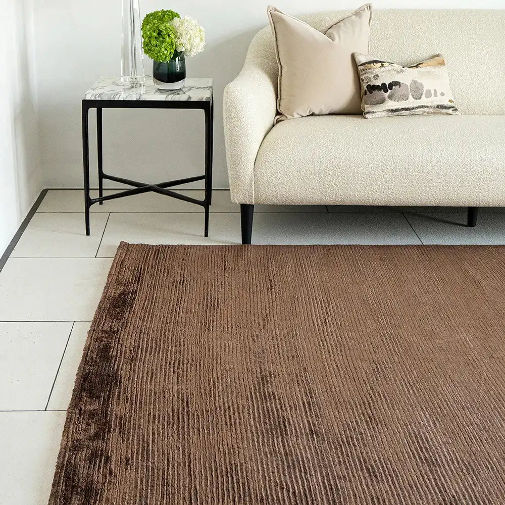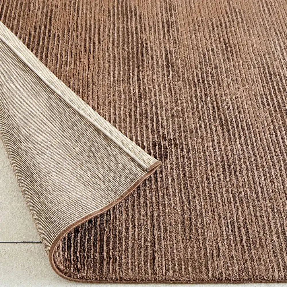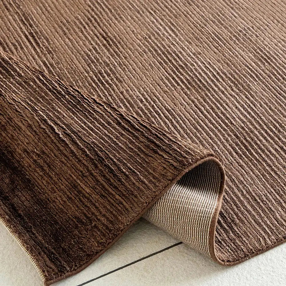 Этот ковер в насыщенную коричневую полоску придаст изысканный блеск любому интерьеру. Прямоугольный ковер приподнят за счет узких текстурированных полос по ширине и имеет блестящую текстуру, которая вам обязательно понравится.