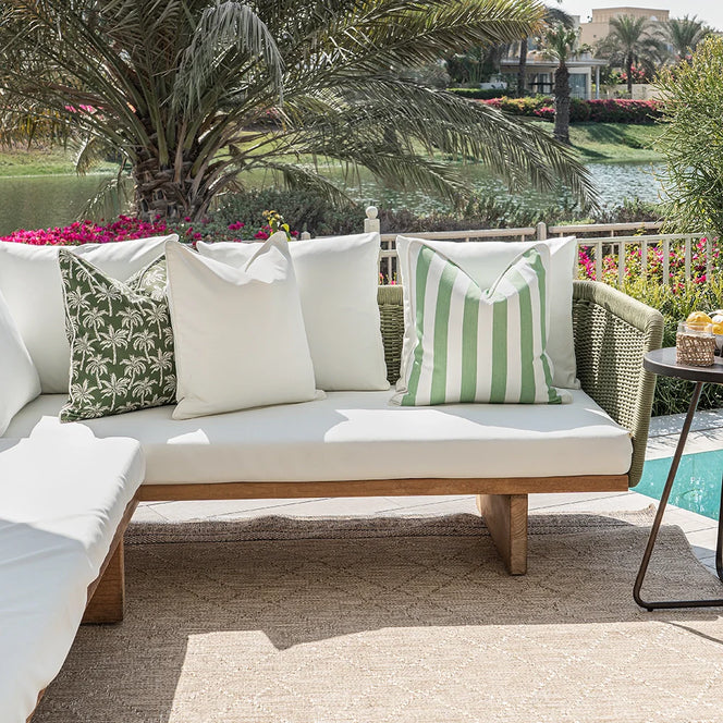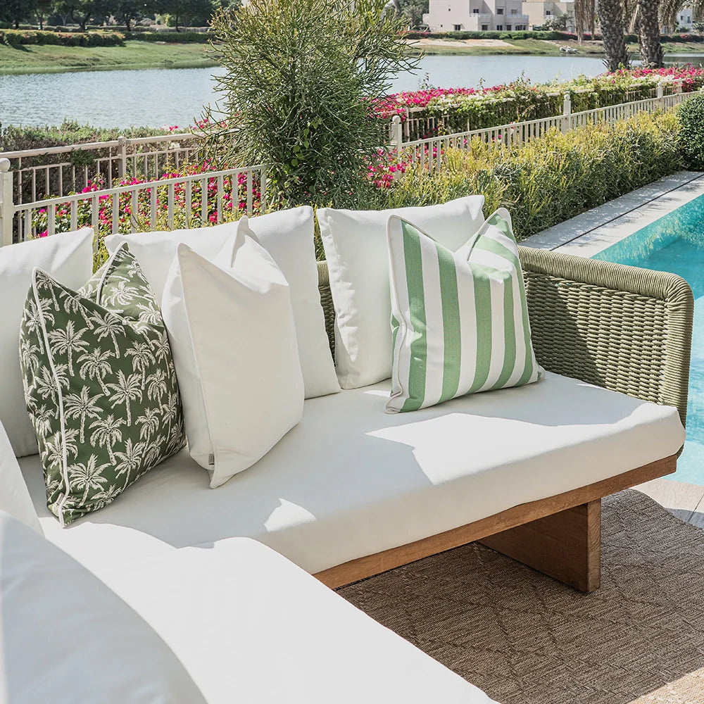 Яркие полосы и игривые пальмы гармонично сочетаются в этом комплекте из трёх подушек. Этот дизайнерский комплект подушек в оттенках зелёного и слоновой кости идеально подойдёт для оформления патио в новом сезоне.