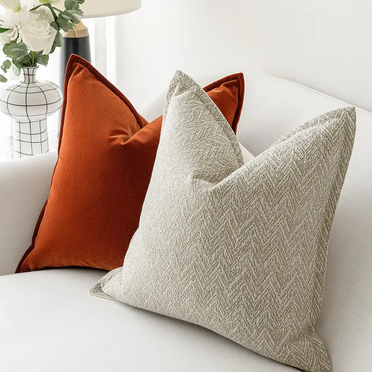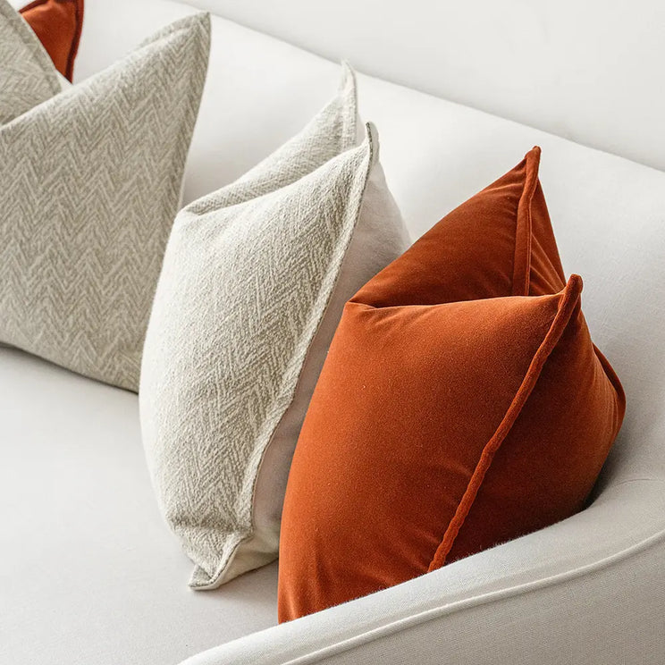 Дизайн: Две подушки из ржавого бархата и две зигзагообразные подушки с контрастной спинкой.