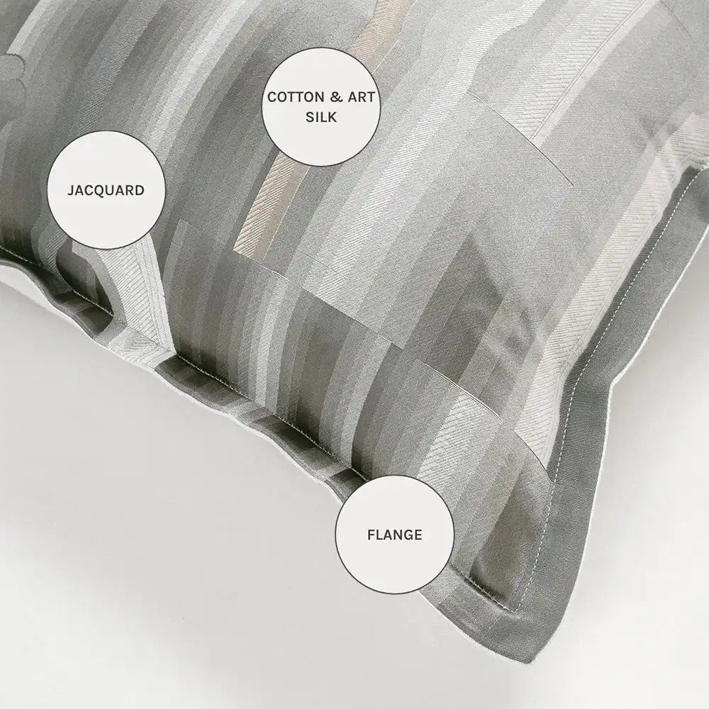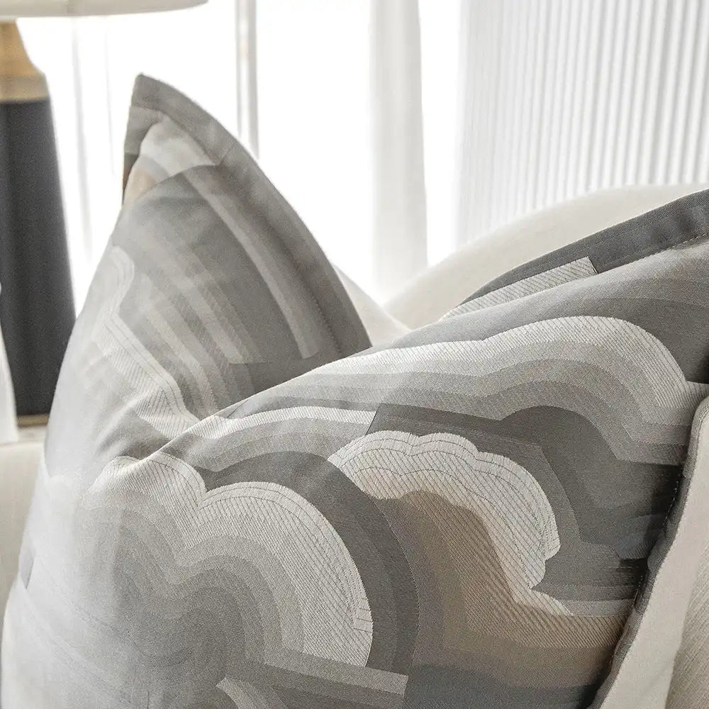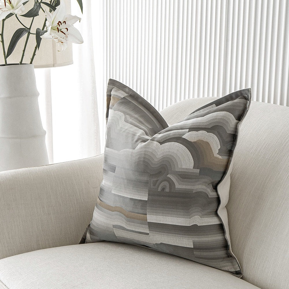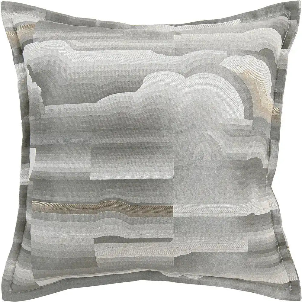 Эта серебряная подушка имеет линейный дизайн облаков спереди, подчеркнутый различными стилями стежек и акцентами серого и золотого. Это прекрасный способ сделать нейтральную схему декора яркой.