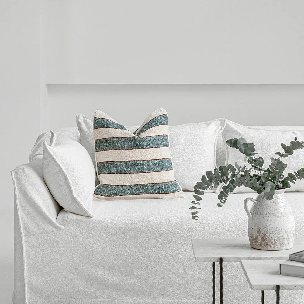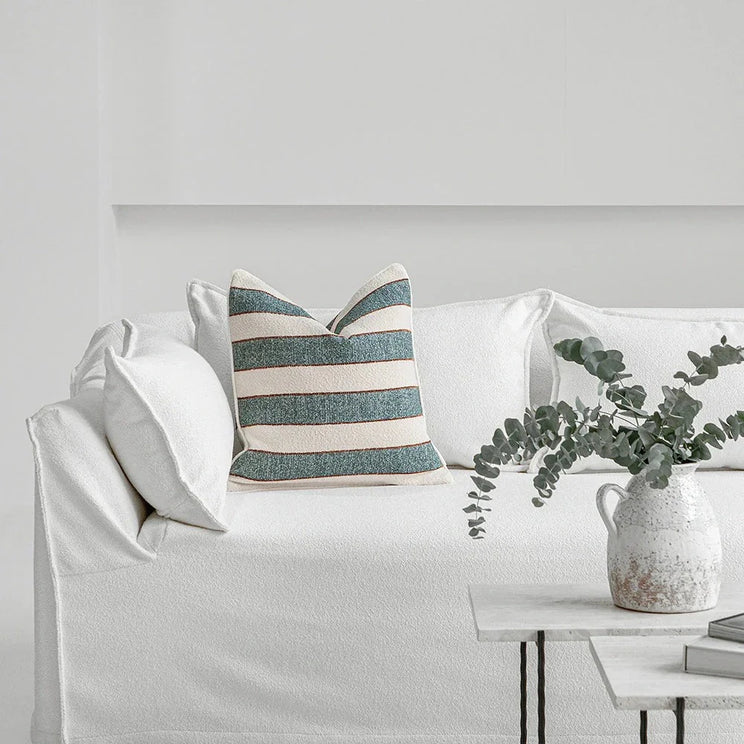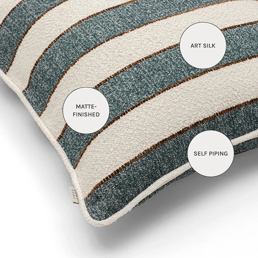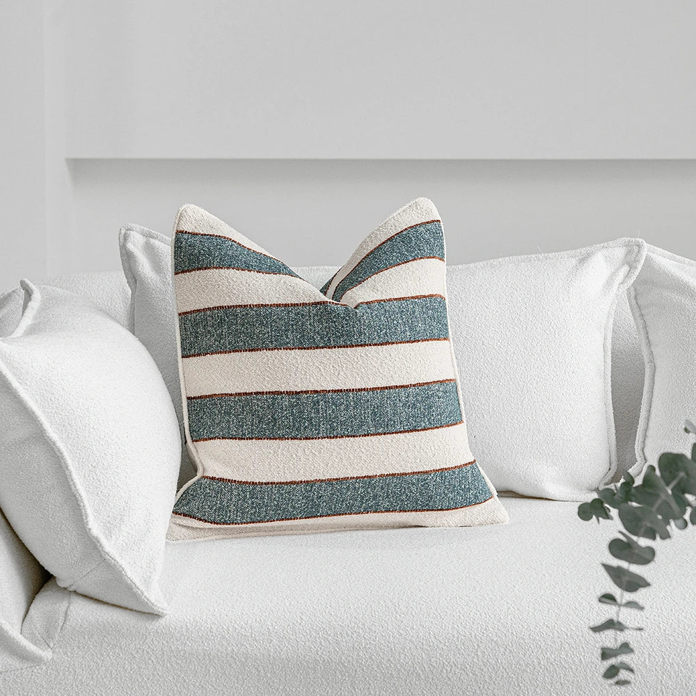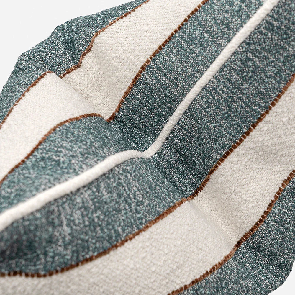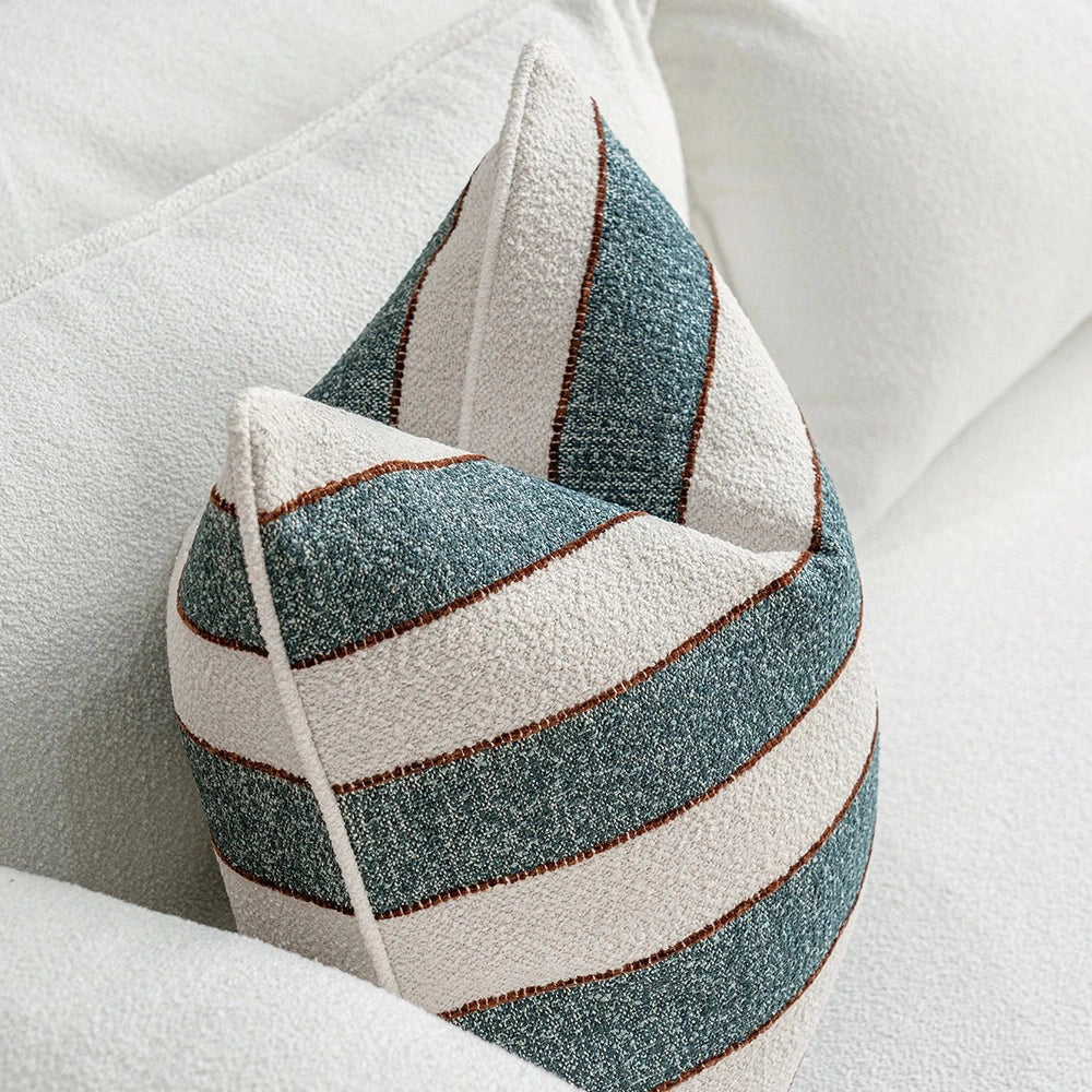 Текстурированная подушка из букле с широкими полосами и едва заметным контрастом, сочетающая в себе непринужденное очарование и изысканное мастерство. Ее приятная на ощупь текстура придает глубину и спокойный характер любому пространству.