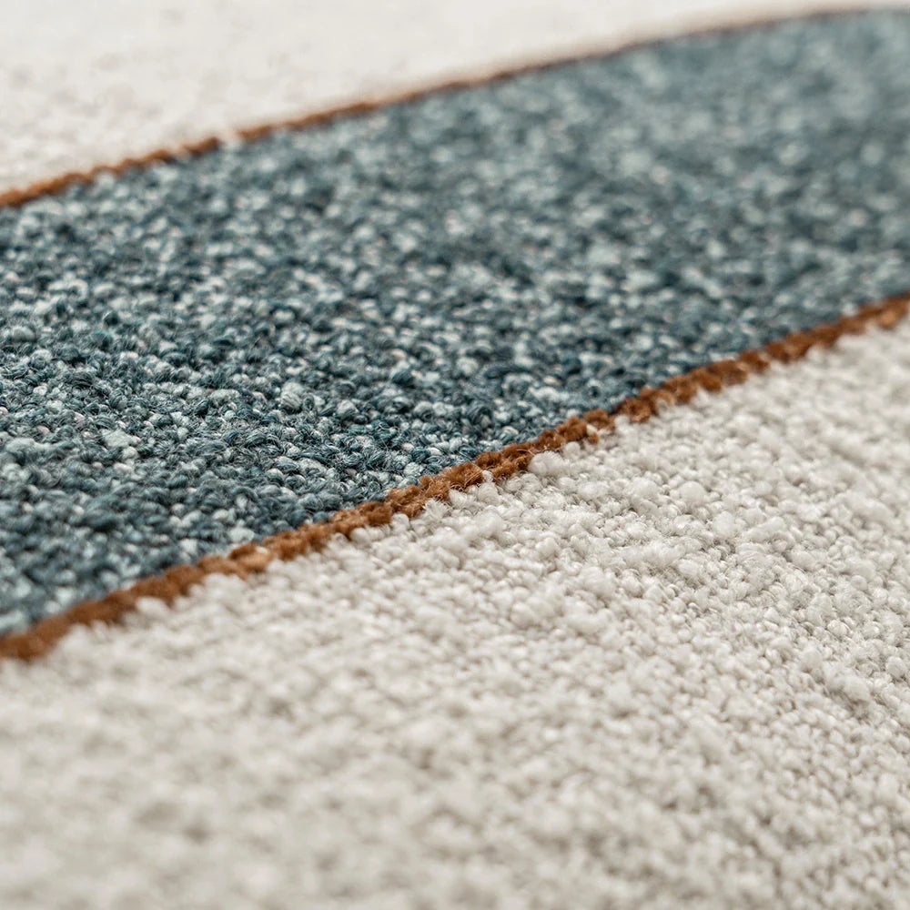 Дизайн: Широкие горизонтальные полосы из мягкой букле-ткани; чередующиеся полосы морского синего и кремового цвета, окаймленные тонкими линиями цвета какао; отделанный гладкий, аккуратный край.