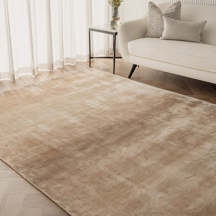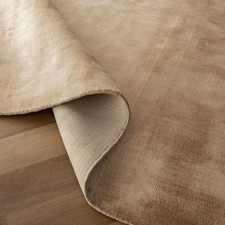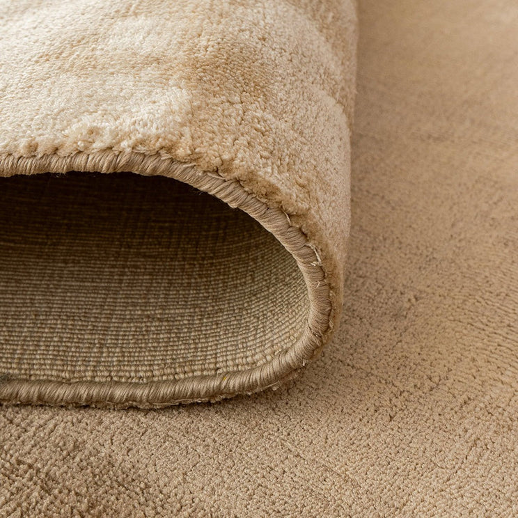 Этот ковер теплых бежевых и золотых цветов имеет дизайн омбре, который переливается при естественном освещении, придавая оживленность вашему жилому пространству.